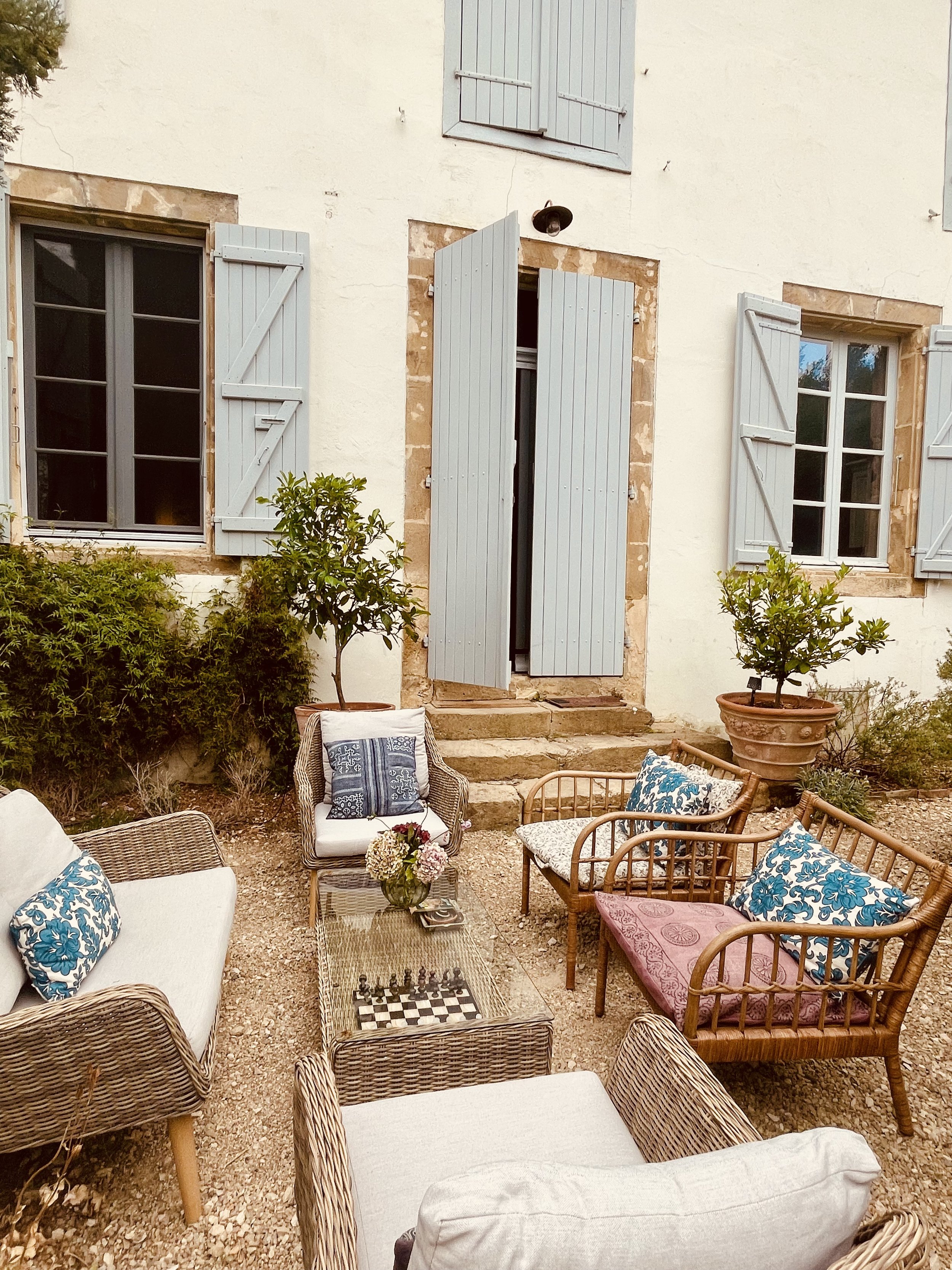 Outdoor patio with wicker and wooden furniture, cushions, potted plants, and a stone house with blue shutters.