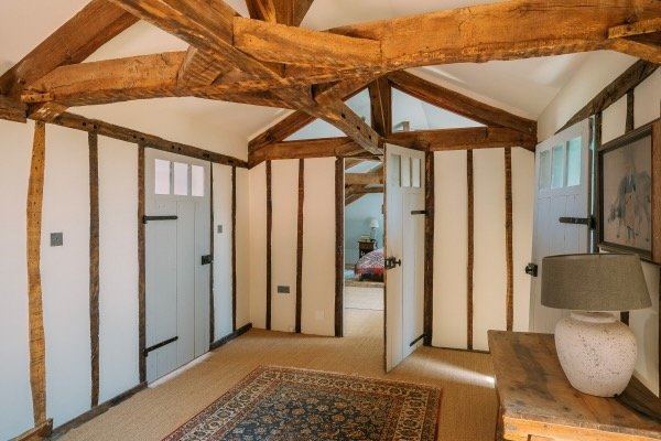 Room with exposed wooden beams, three doors, a patterned rug, and a wooden table with a lamp.