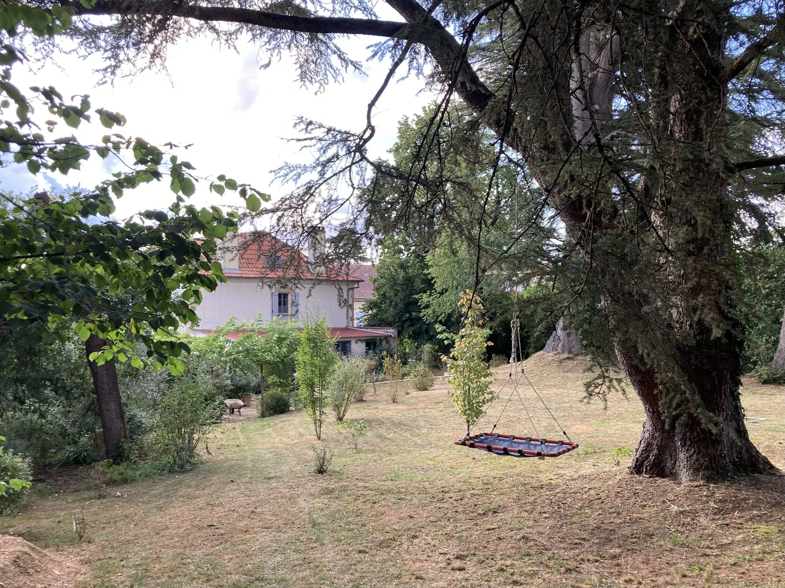 A backyard with a large tree, a swing hanging from a branch, and a white house with a red-tiled roof in the background. The yard has grass and various bushes.