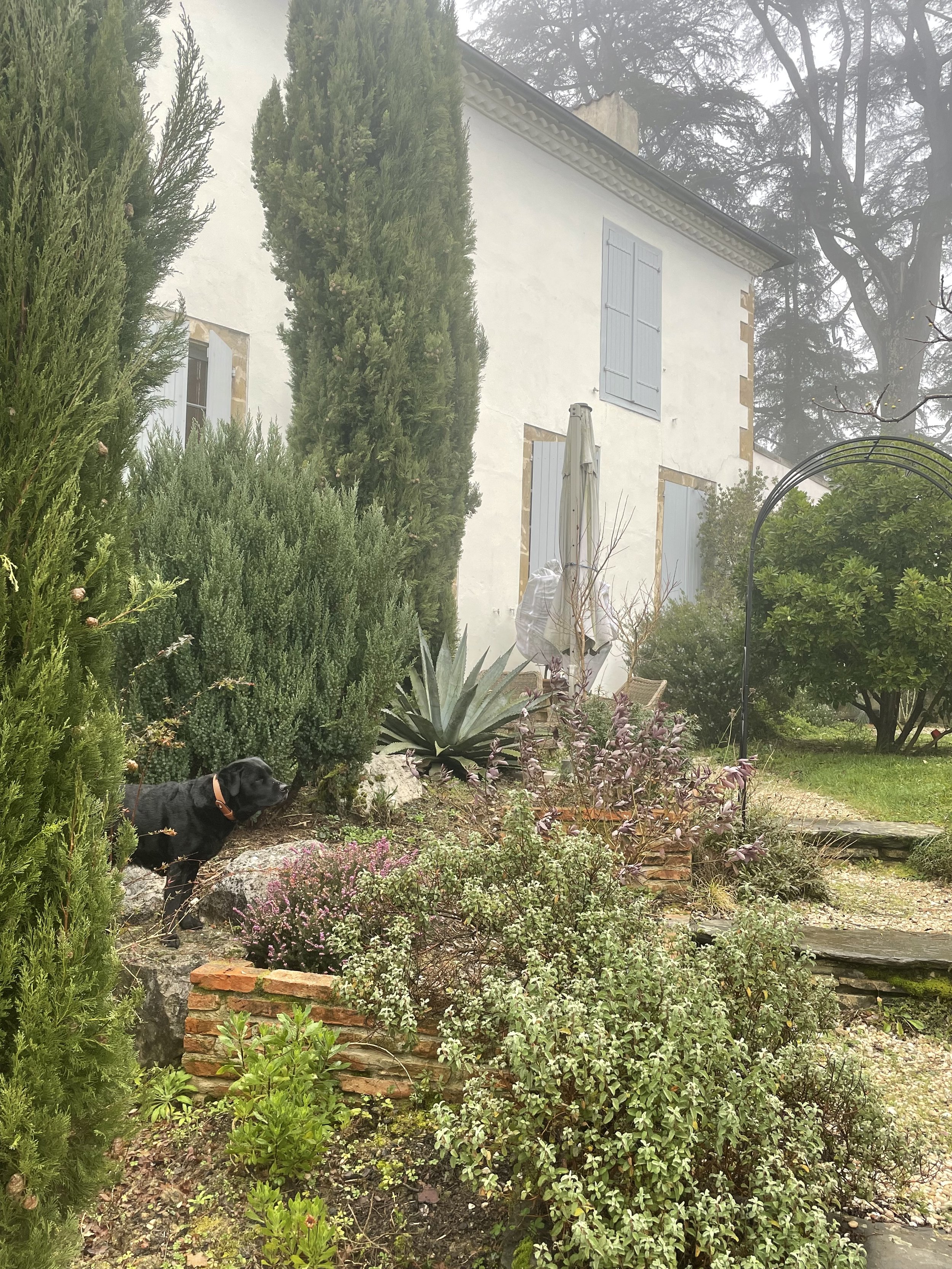 A garden with a variety of shrubs and plants, including a large agave, in front of a white house with blue shutters. There is a black dog with an orange collar among the plants, and some wooden steps leading up in the garden. A foggy or misty atmosph