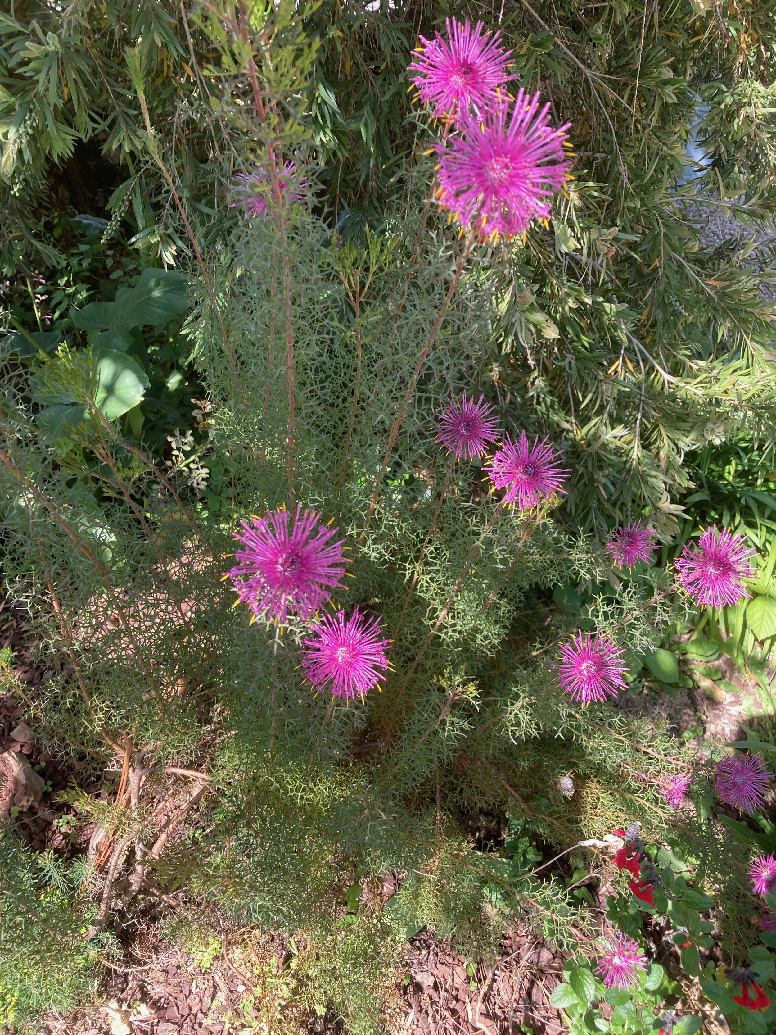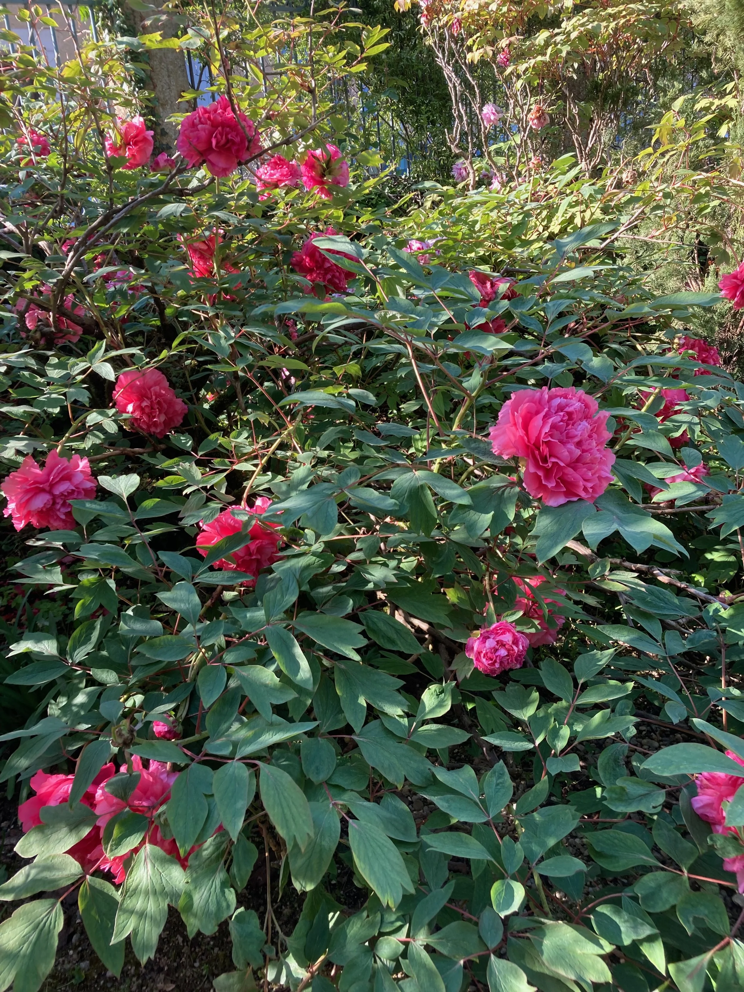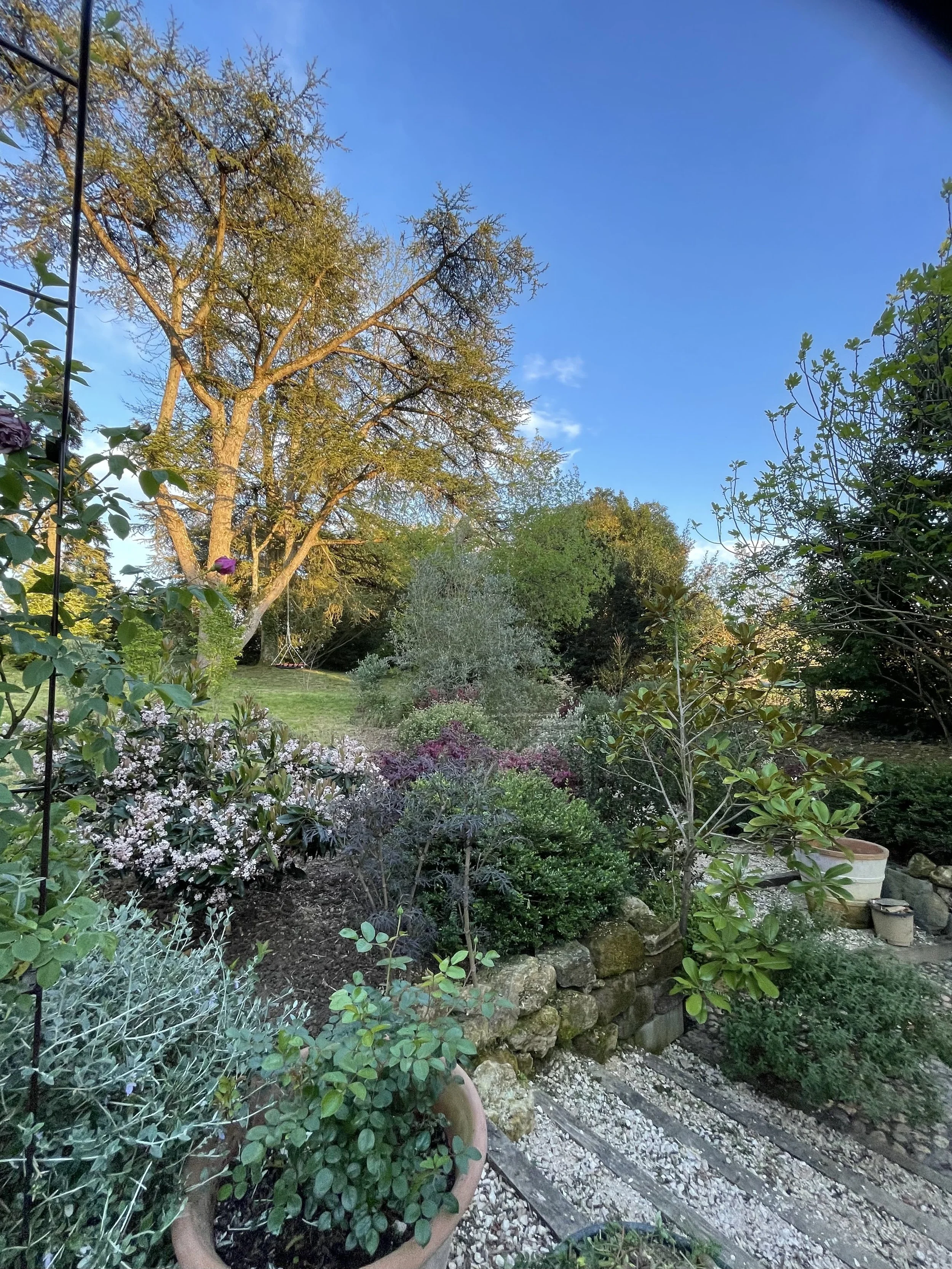 A lush garden with a variety of shrubs, flowering plants, and trees, a stone-bordered pathway, potted plants, and a large tree under a bright blue sky. View fullsize