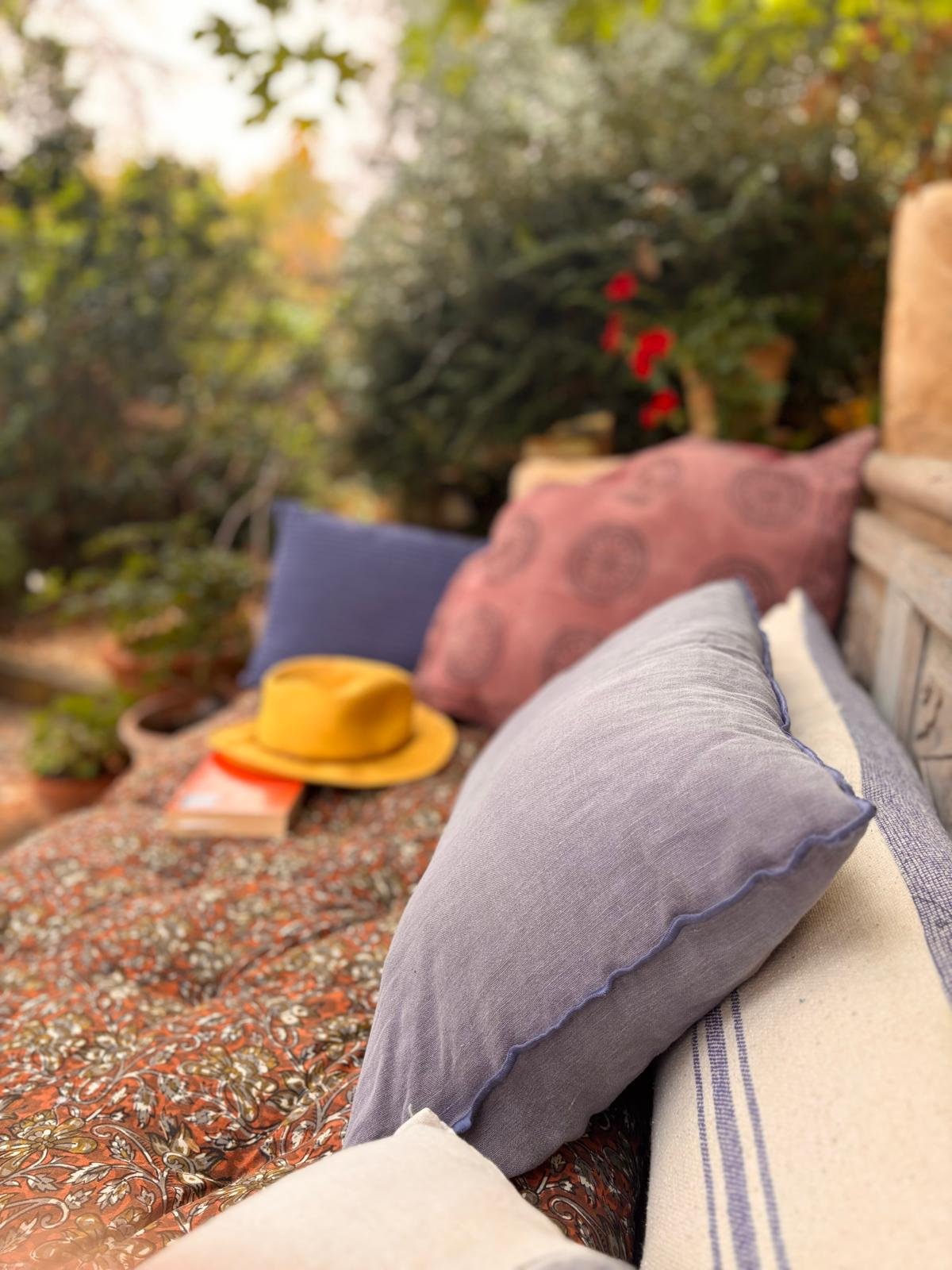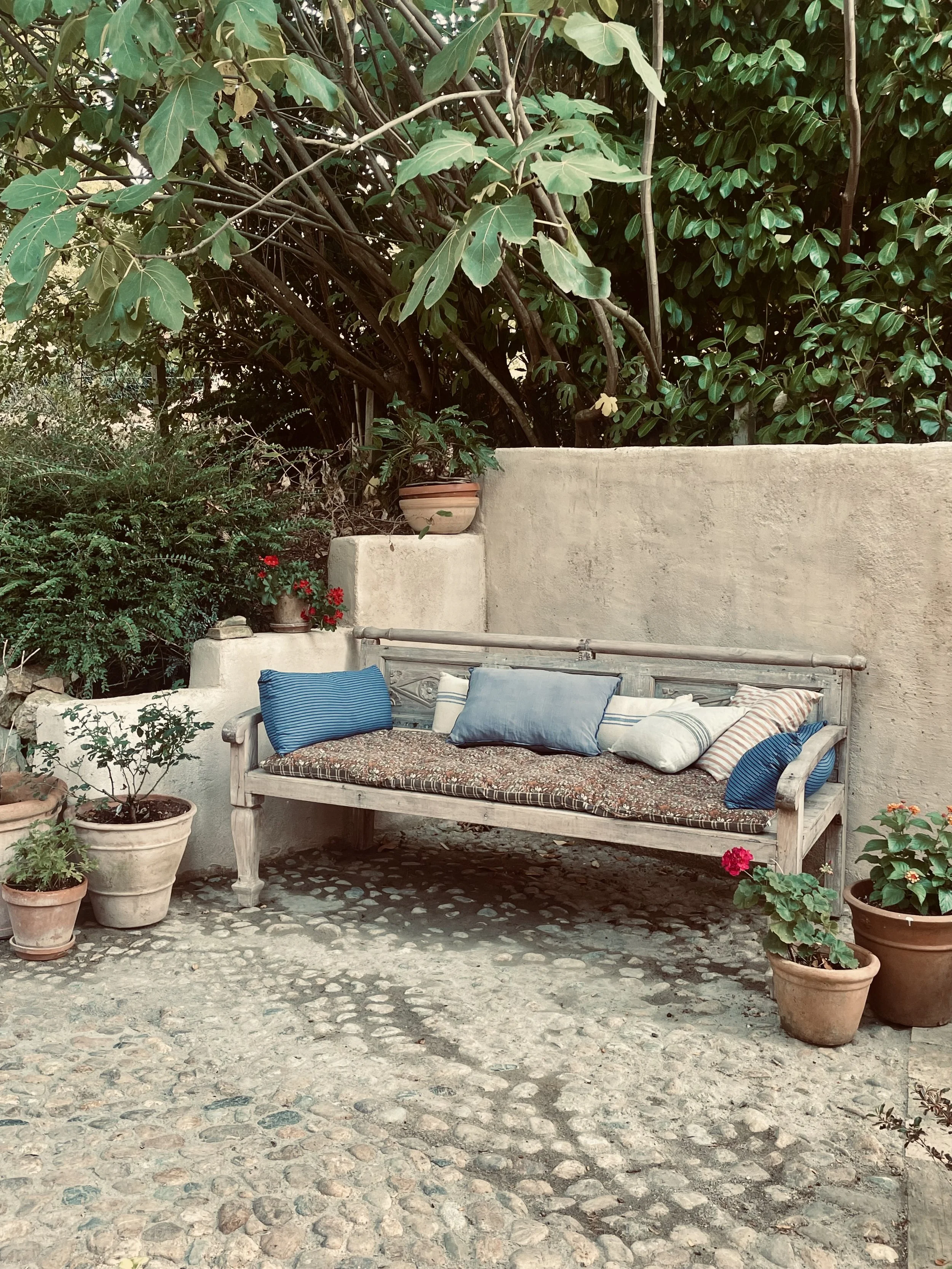 A rustic outdoor patio scene with a vintage wooden bench adorned with various blue and striped cushions, surrounded by potted plants and greenery, against a stucco wall and cobblestone ground. View fullsize