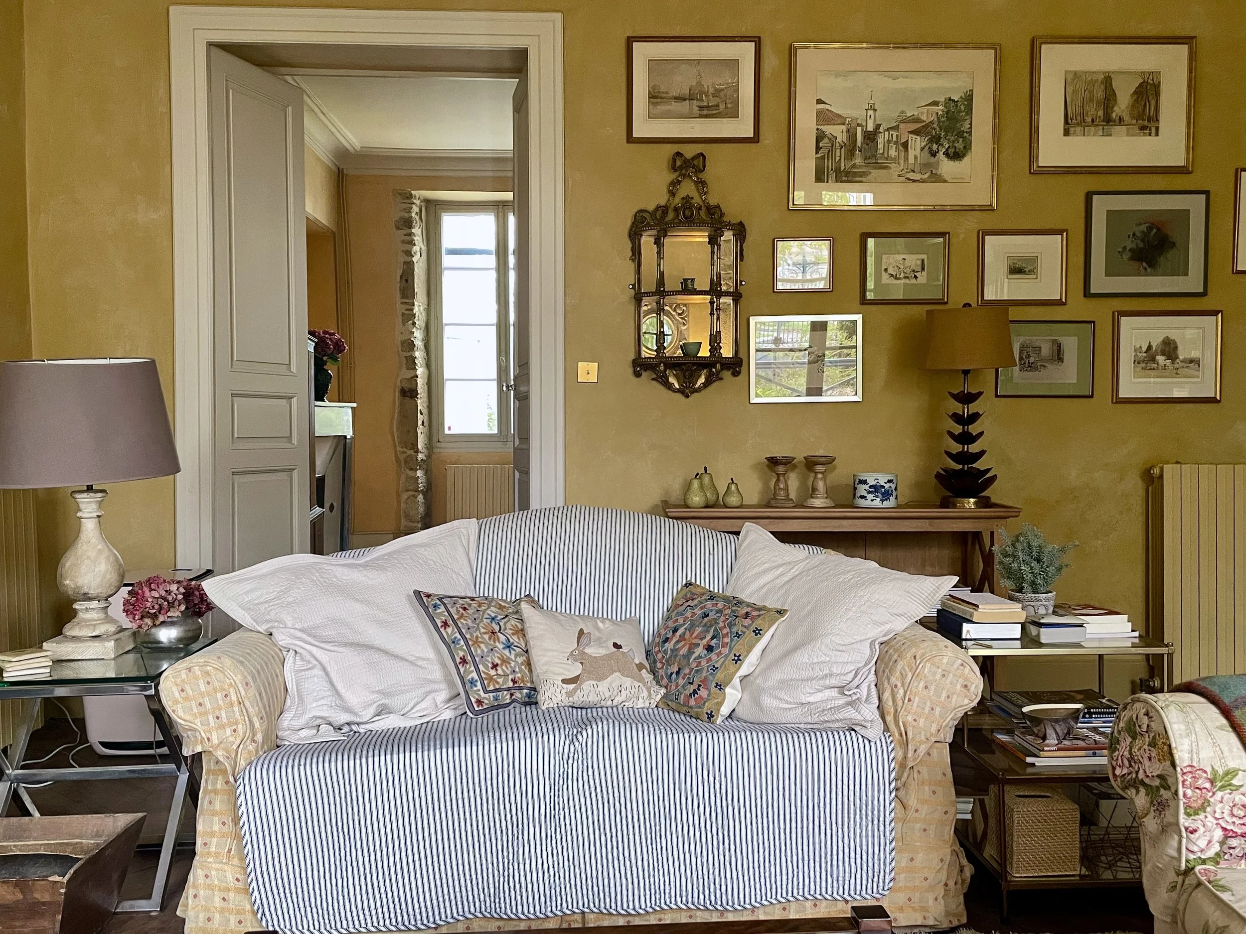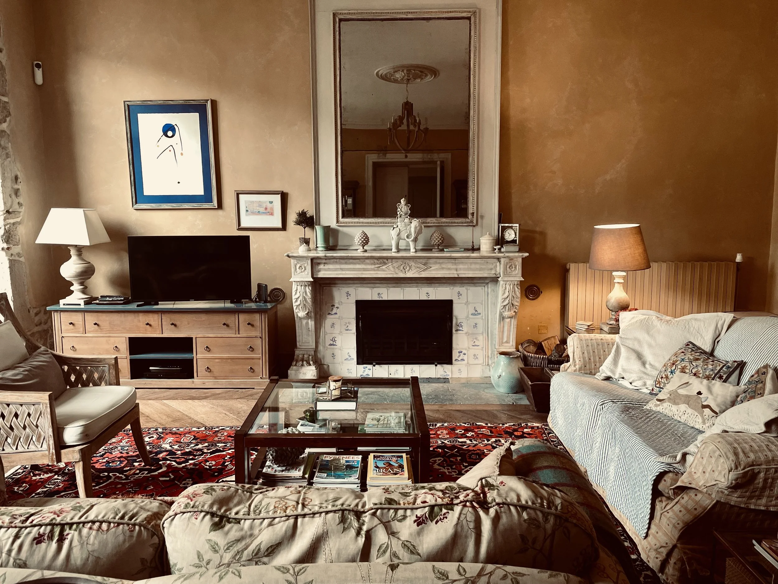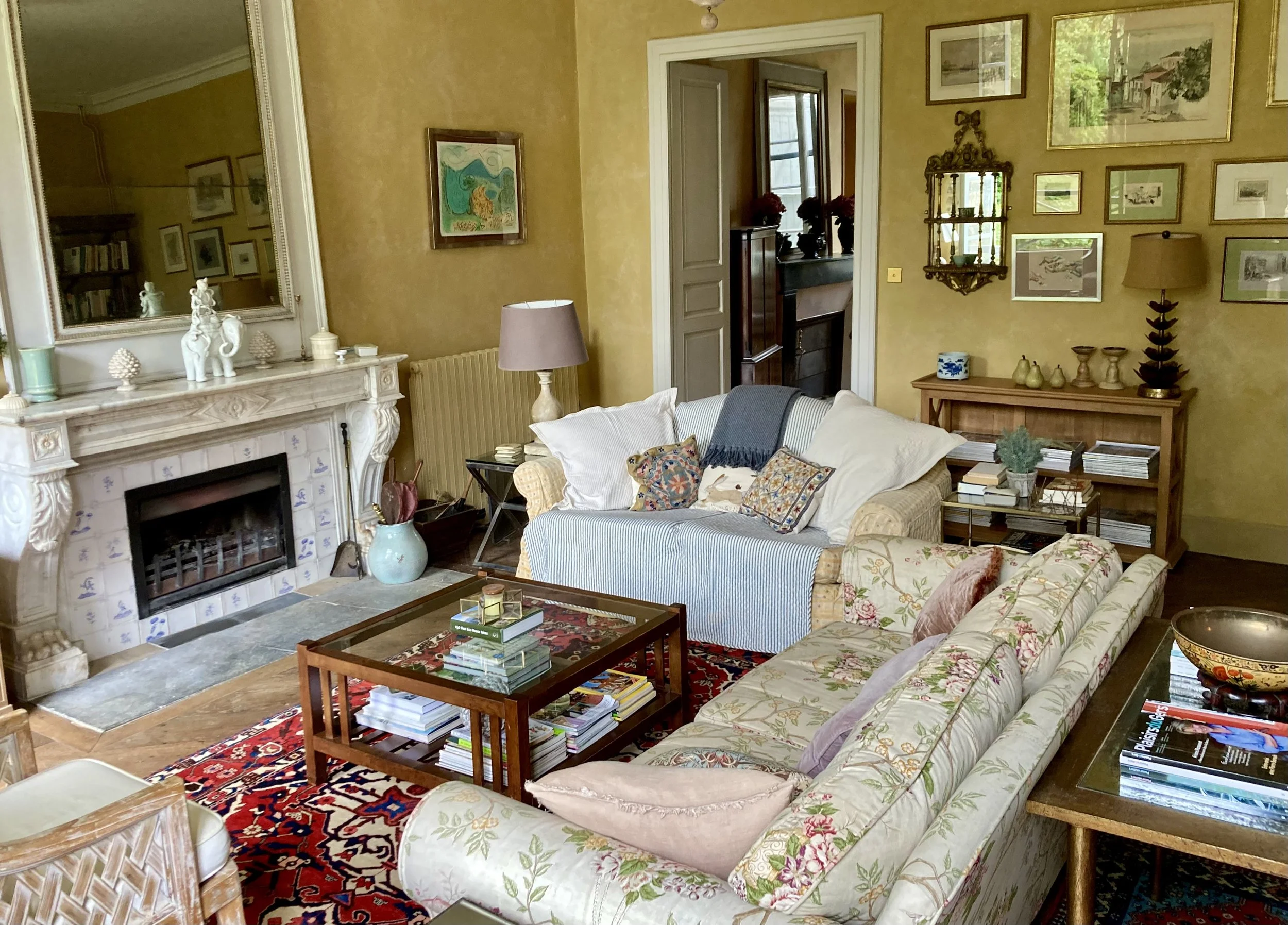 Cozy living room with floral and striped sofas, a fireplace, wooden coffee table, and various decorative items, paintings, and books on shelves.
