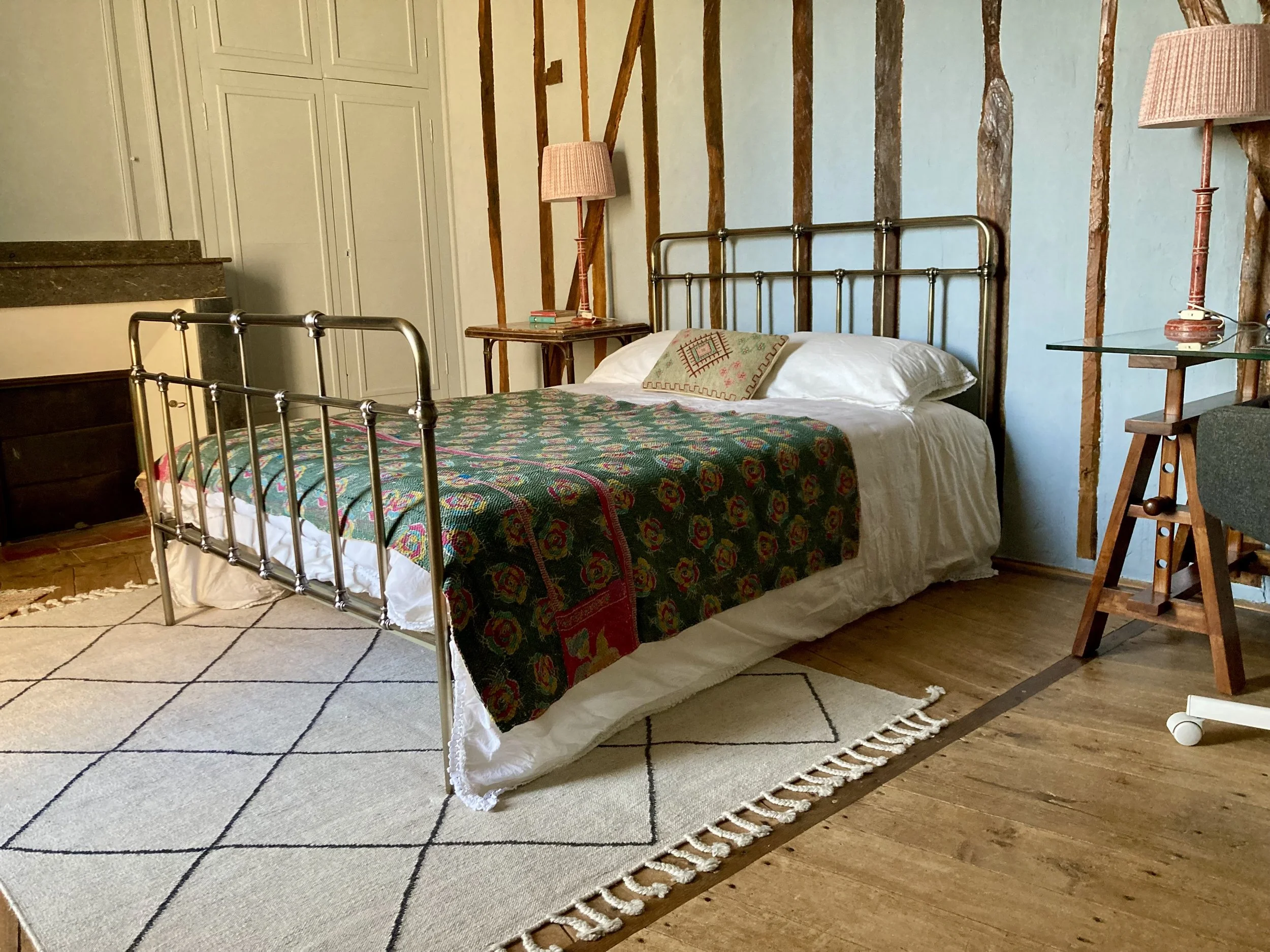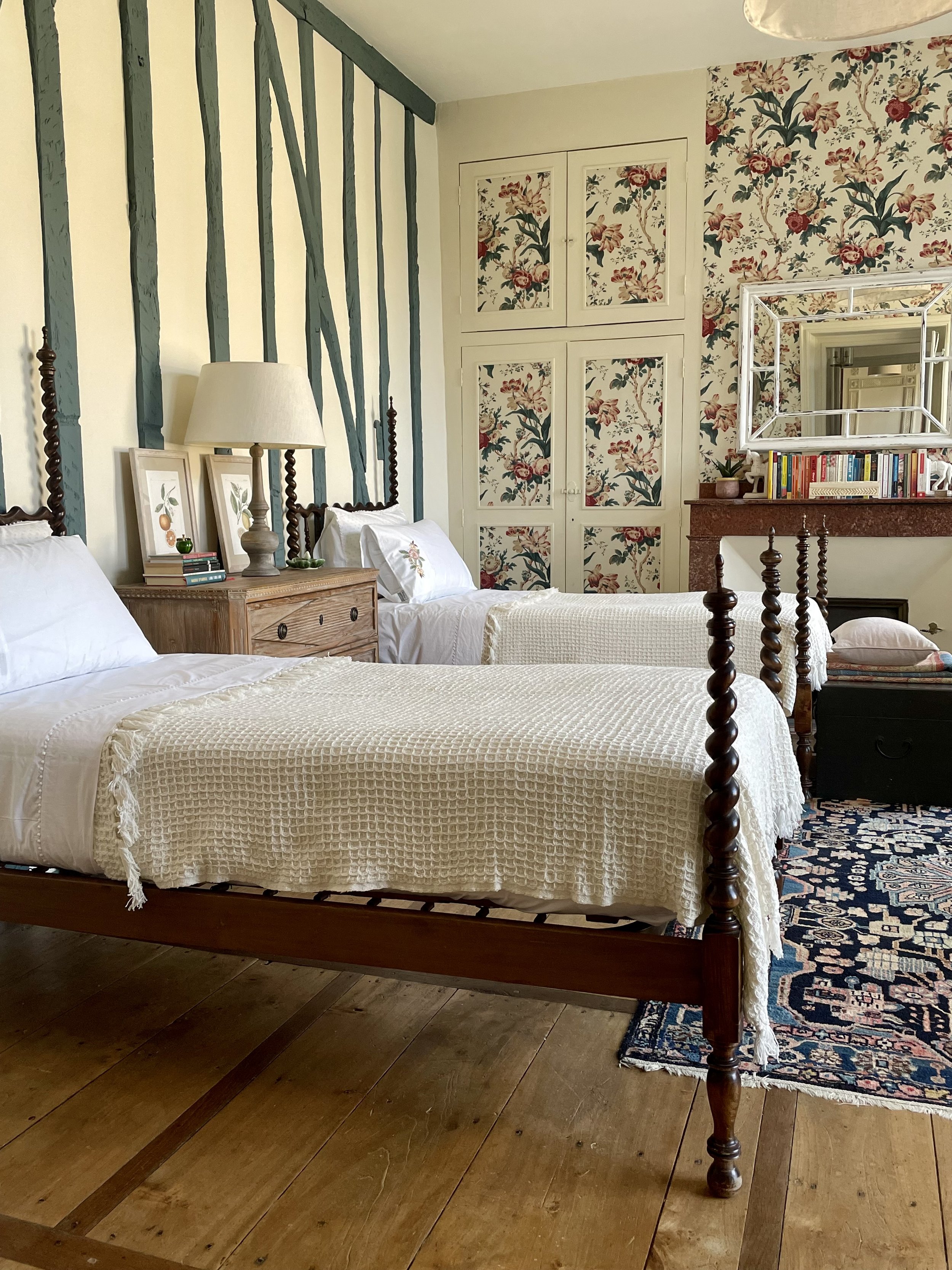 A bedroom with two wooden beds with white bedding and textured blankets, a wooden nightstand with a lamp and framed artworks, floral wallpaper and painted beams on the wall, a large mirror, and a patterned rug on a wooden floor.