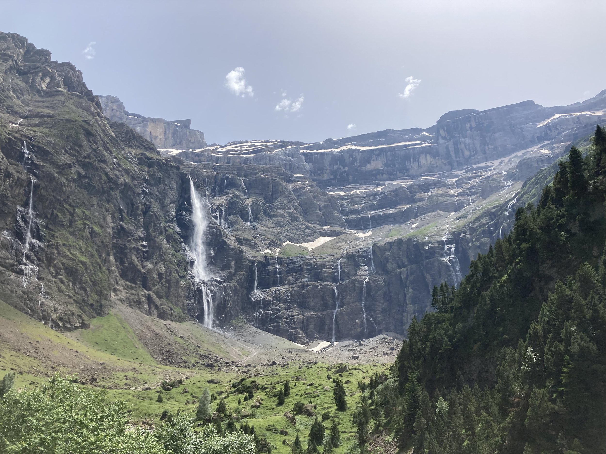 Mountain landscape with waterfalls, rocky cliffs, green vegetation, and a clear sky in the background. View fullsize