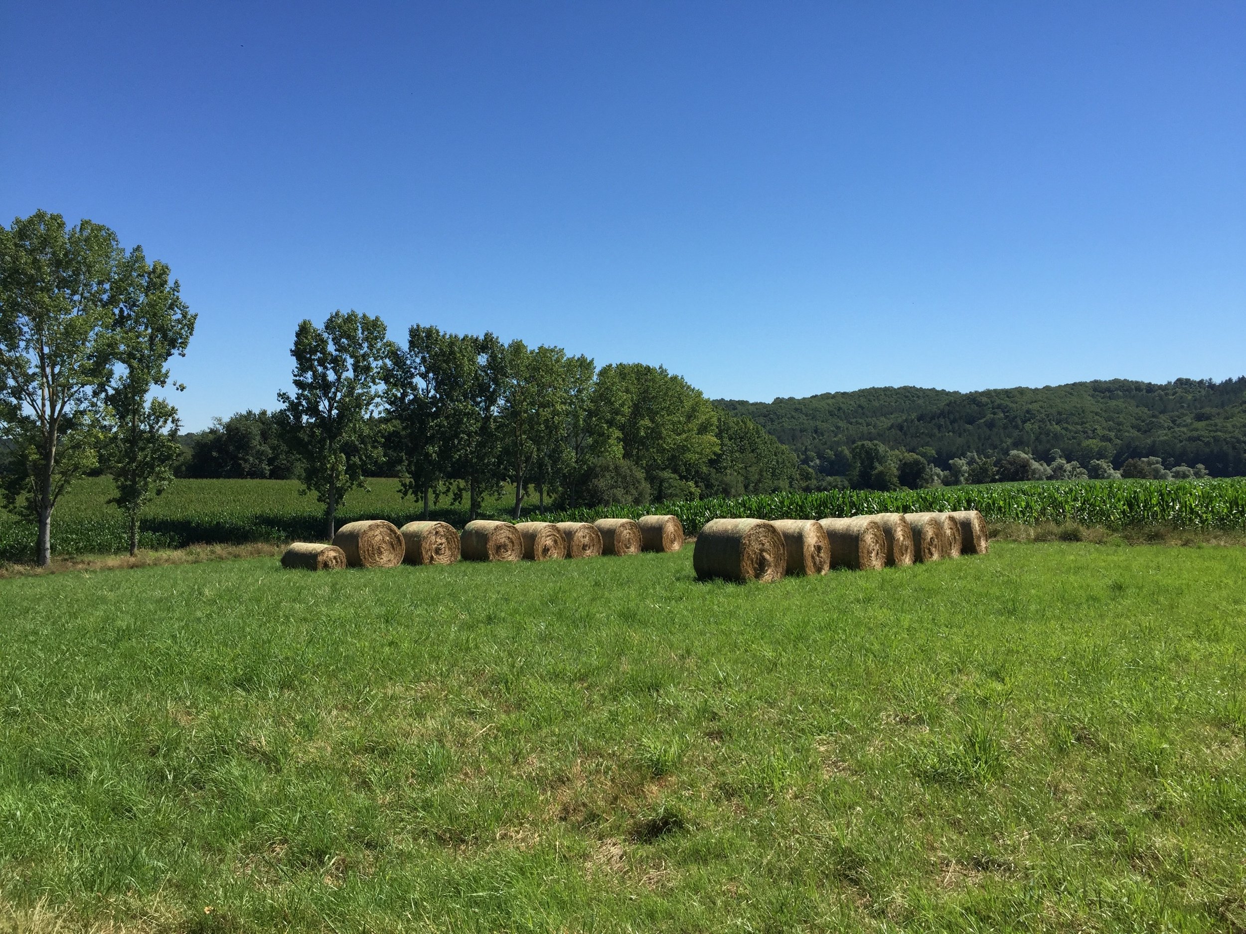 Hay bales in a grassy field with trees and hills under a clear blue sky. View fullsize