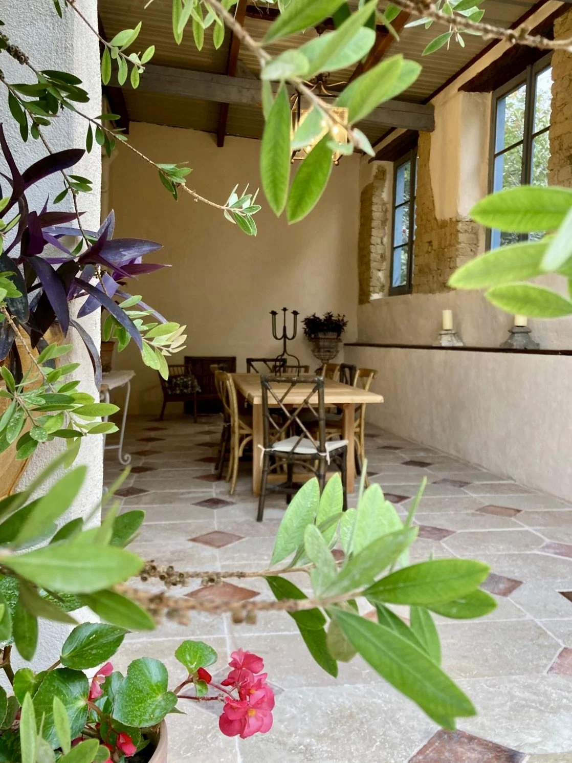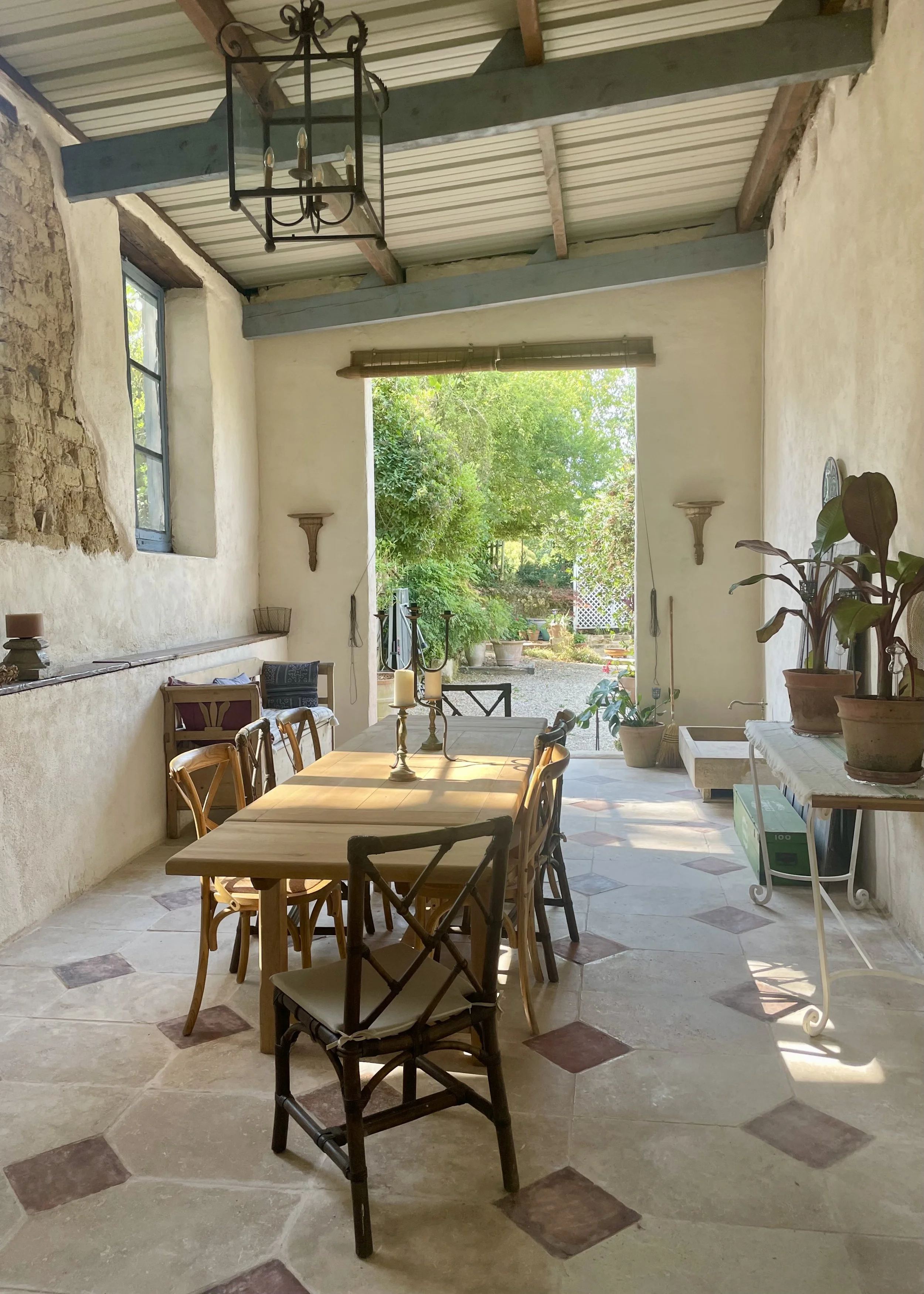 A rustic dining area with a large wooden table, various chairs, potted plants, and open access to a garden or outdoor space with trees and greenery.