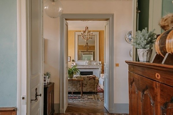 Cozy interior view featuring a hallway leading to a living room. The hallway has a wooden chest and potted plants. The living room includes a chandelier, sofa, fireplace, mirror, and decorative items. Earthy tones and vintage decor create a warm ambi View fullsize