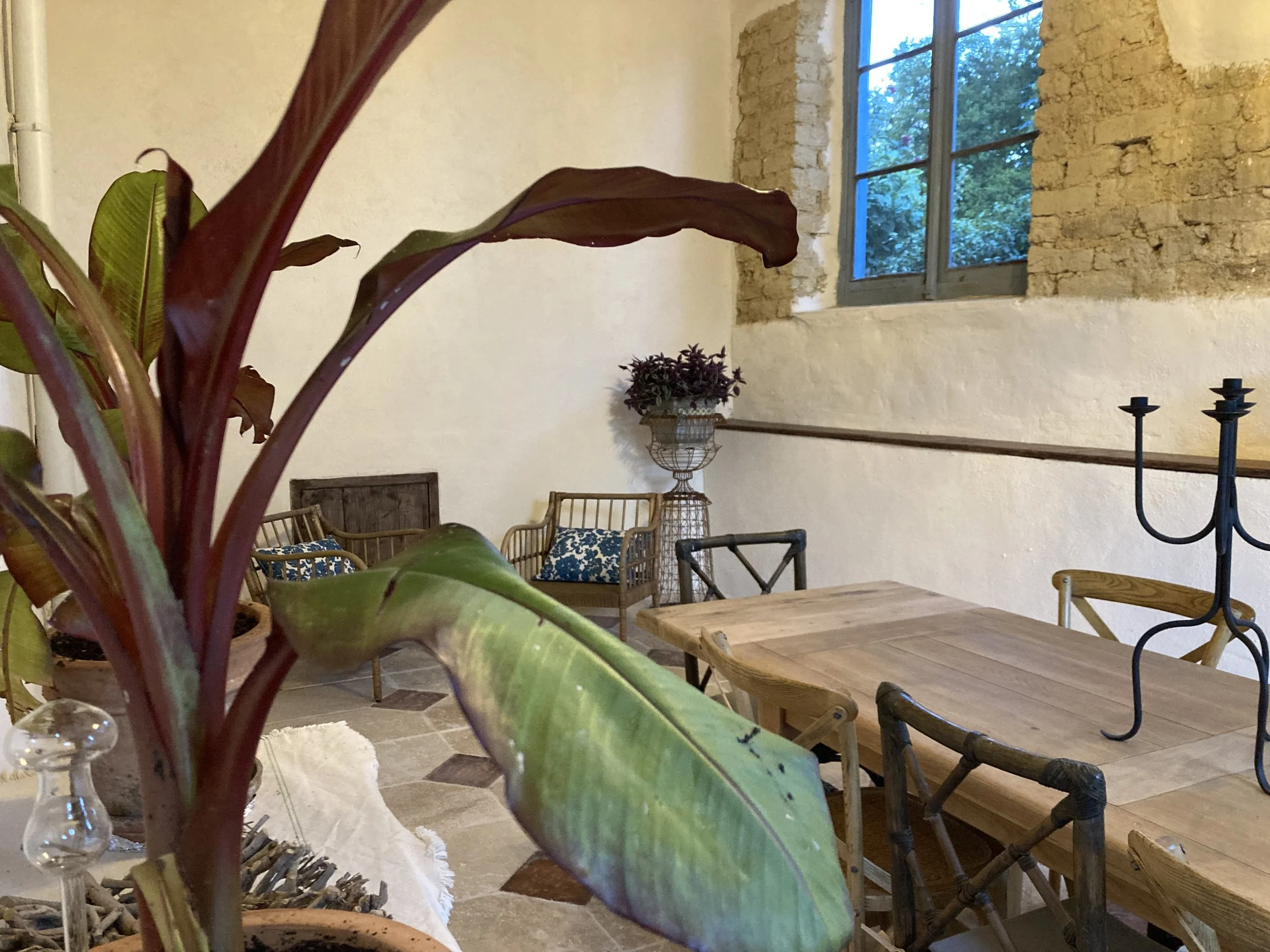 Decorated indoor dining area viewed through leafy green plants, with a wooden dining table, chairs, and a window with stone frames. View fullsize