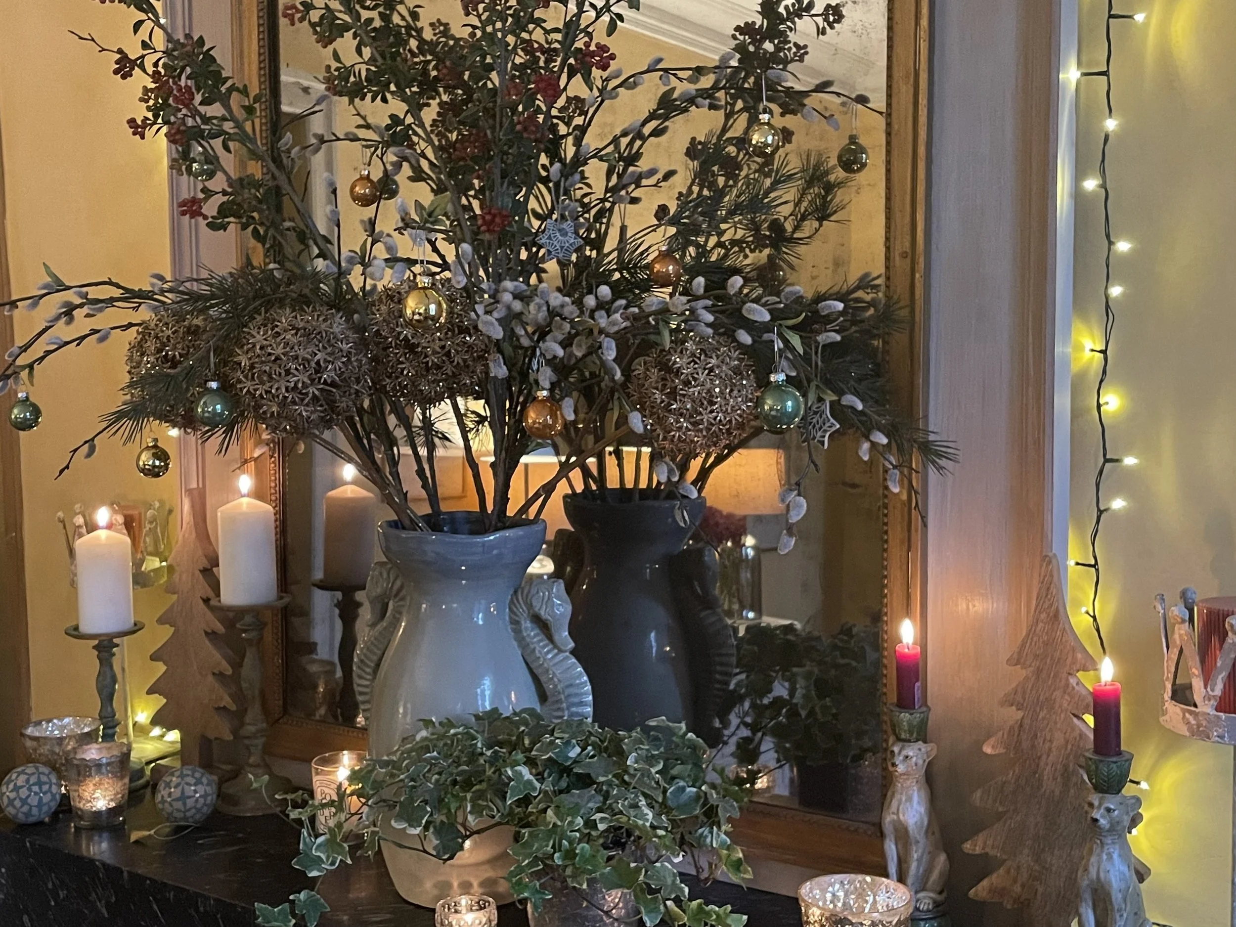 Decorated Christmas table with candles, vases, greenery, and ornaments