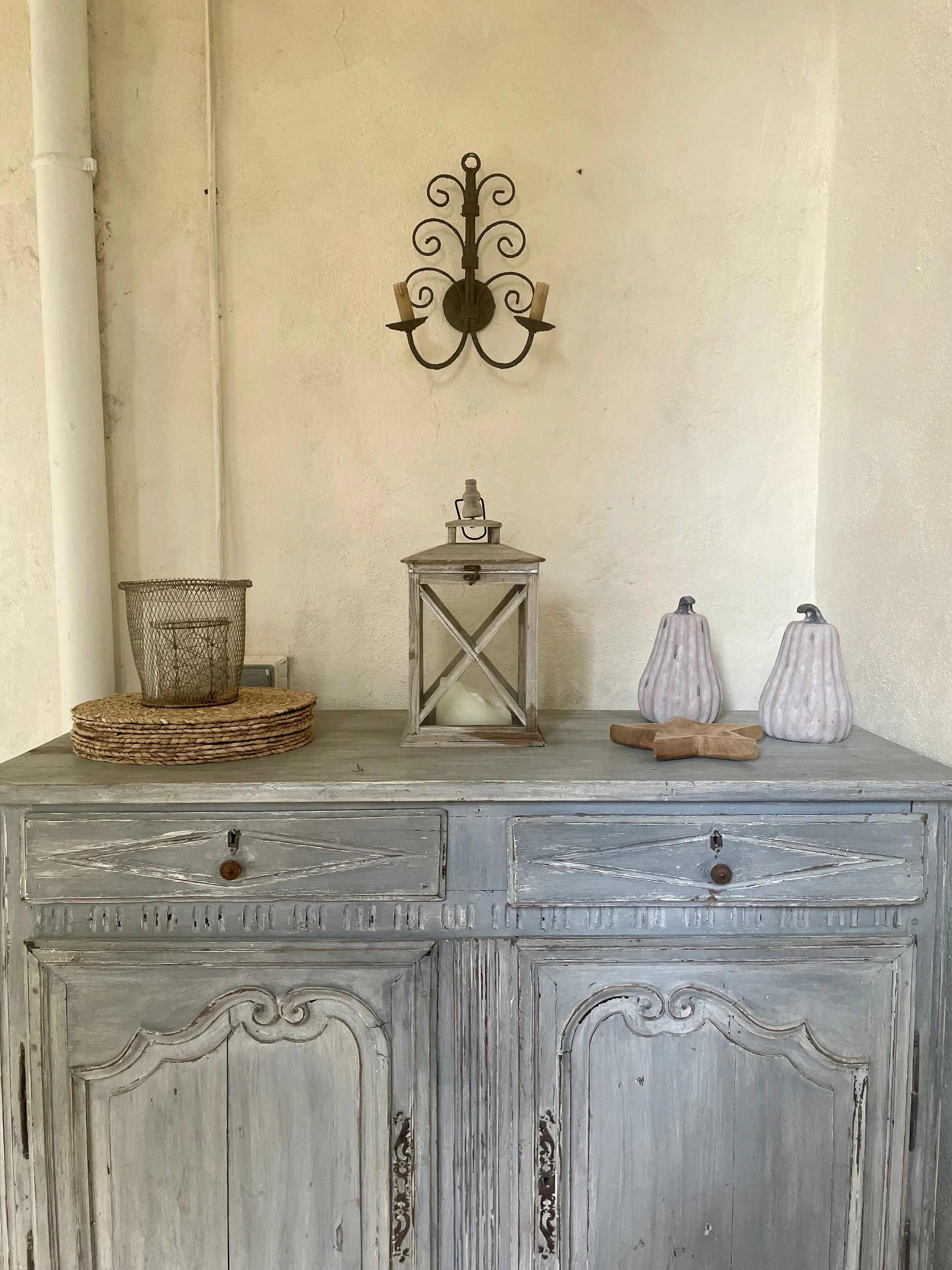 A rustic wooden sideboard with distressed gray finish, decorated with wicker baskets, a lantern, two ceramic gourd-shaped vases, and a small wooden object; a black wrought iron wall sconce with candleholders is mounted above.