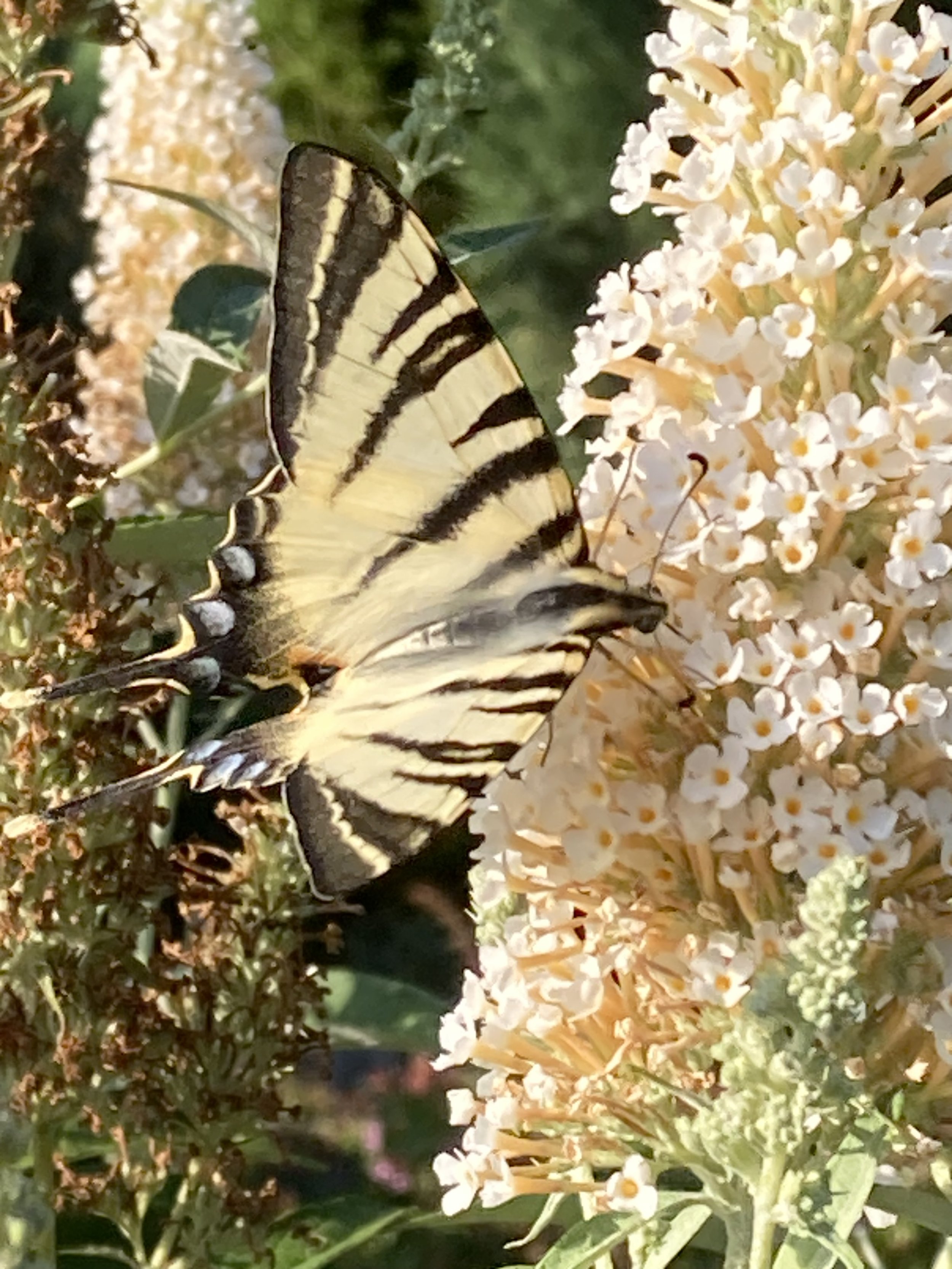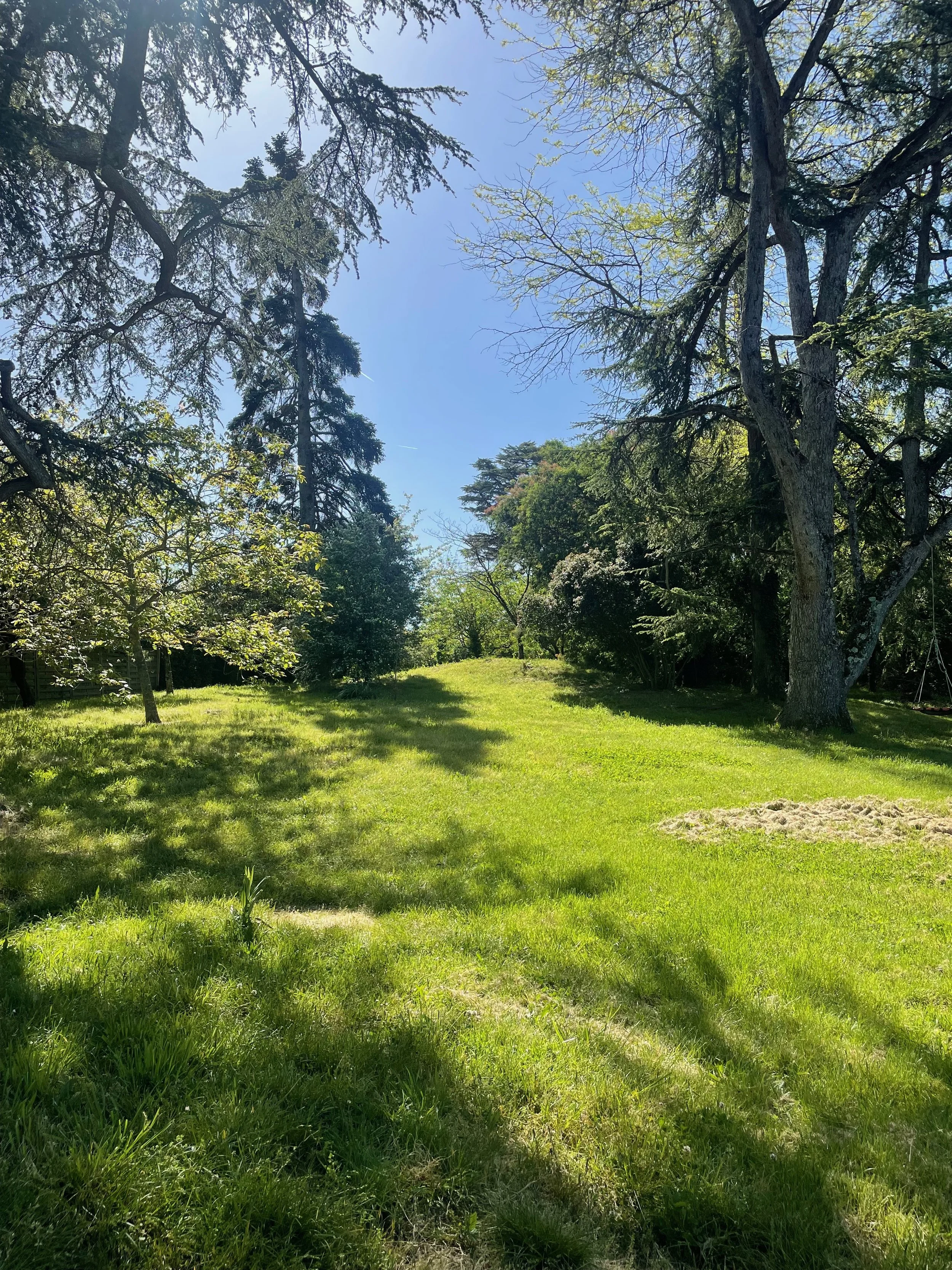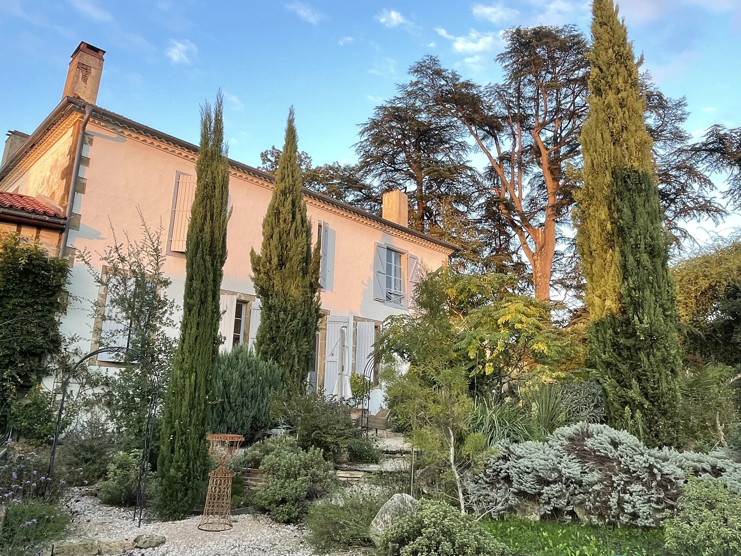 A Mediterranean-style house with white walls and window shutters, surrounded by tall cypress trees and various shrubs. The garden is landscaped with a variety of plants and gravel paths, under a clear blue sky. View fullsize