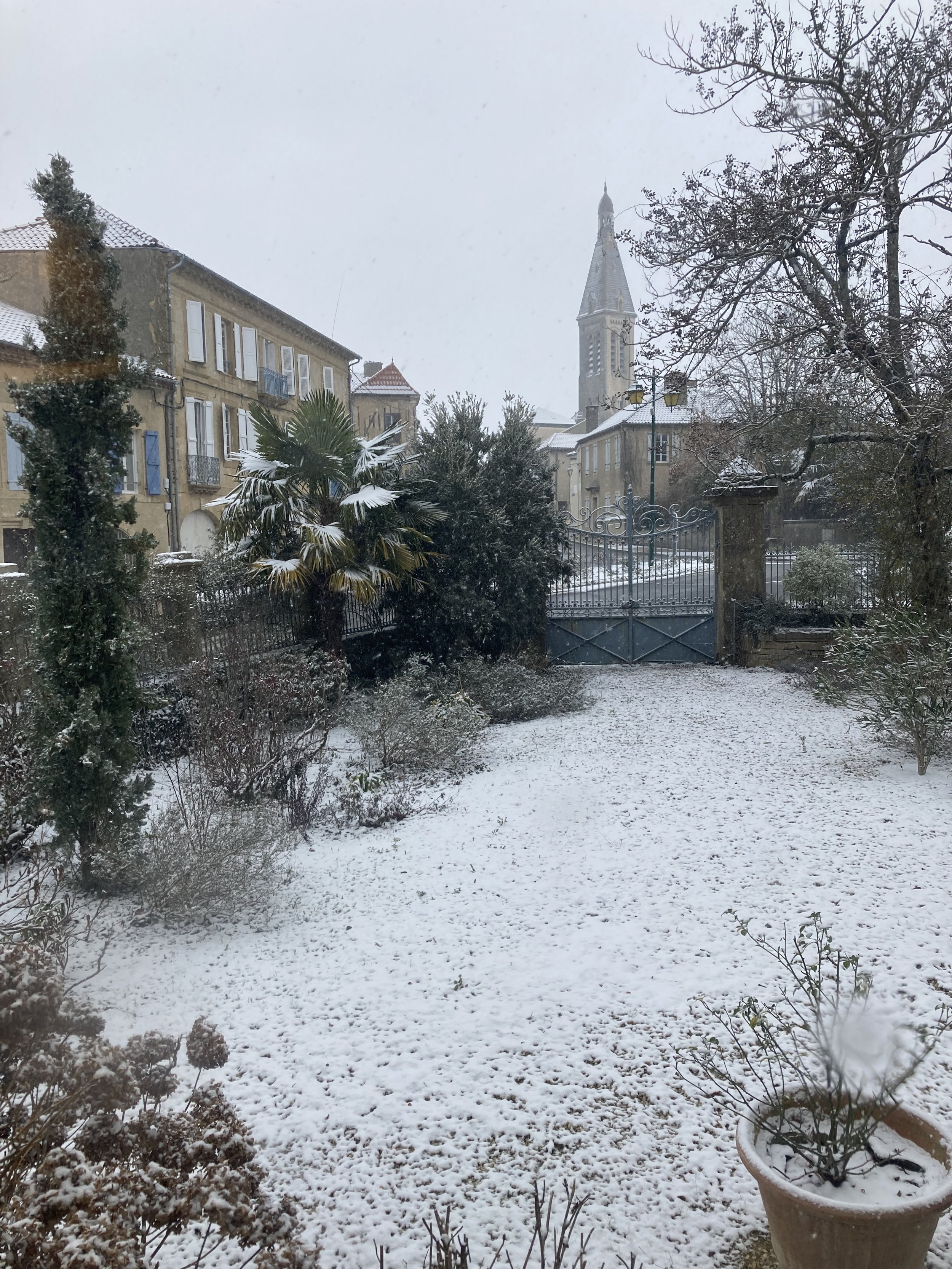 Snow-covered garden with trees and shrubs, a tall structure in the background, and traditional European architecture partially visible. View fullsize