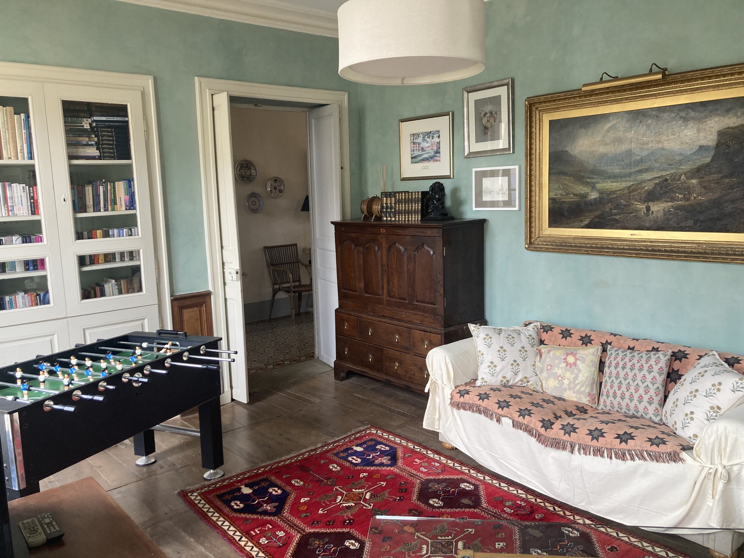 Living room with football table, bookshelf, sofa with patterned pillows, wall art, and a wooden cabinet.