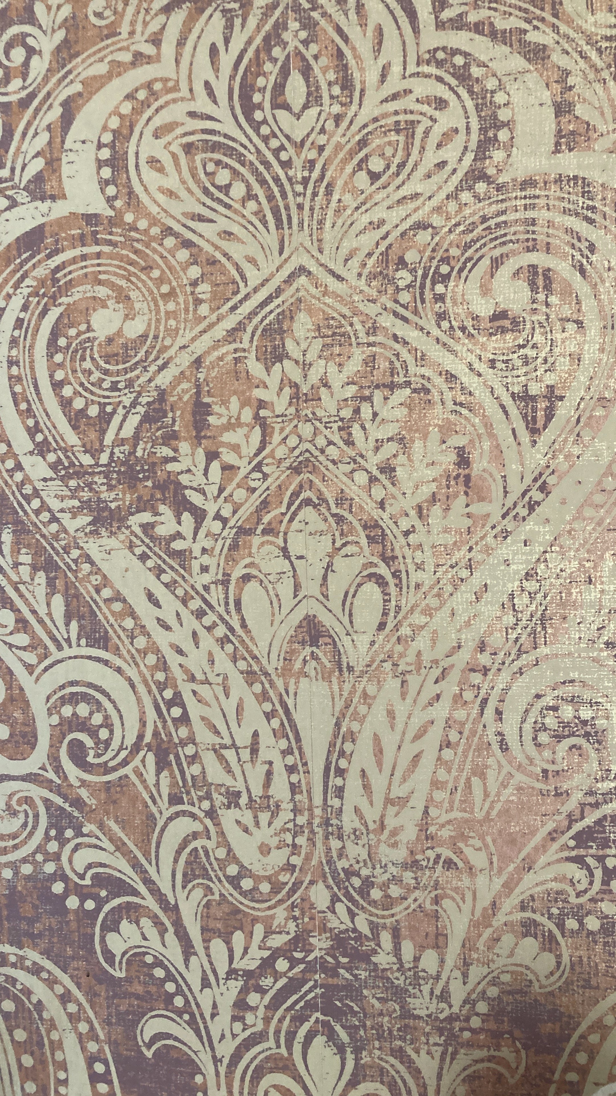 Intricate vintage-style wallpaper design with floral and paisley patterns in cream and brown.