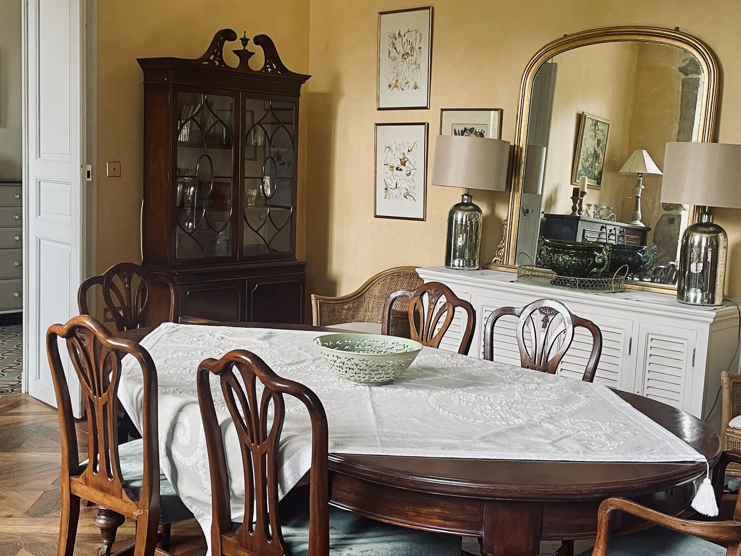 Dining room with wooden table, six chairs, white tablecloth, green bowl, white sideboard with lamps, mirror, and framed artwork on yellow wall, and a dark wooden display cabinet.