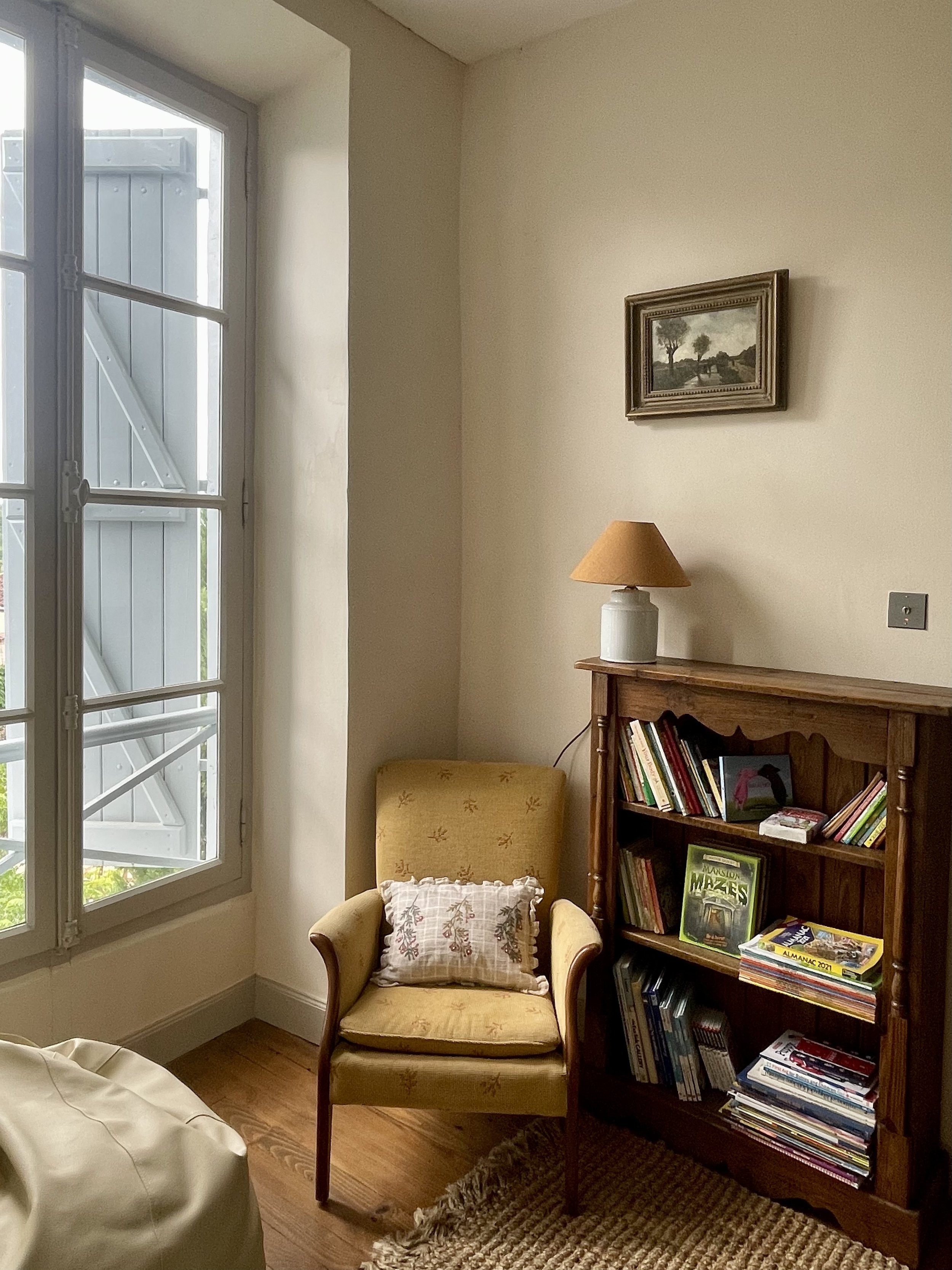 A cozy corner of a room with a large window, a yellow armchair with a decorative pillow, a wooden bookshelf filled with books and magazines, a small table lamp, a framed landscape painting on the wall, and a woven rug on hardwood floor.