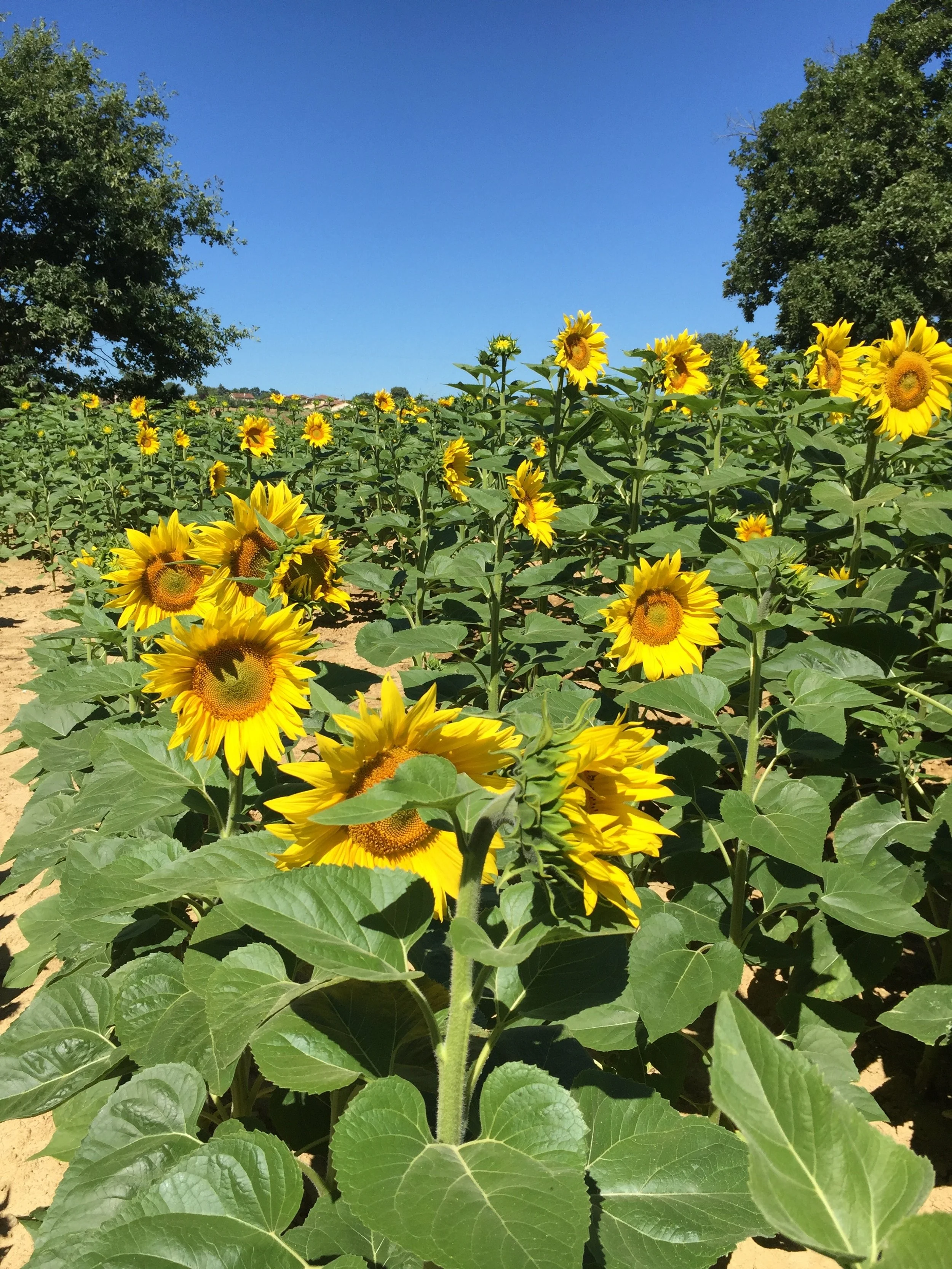 Field of sunflowers under a clear blue sky, with trees in the background.