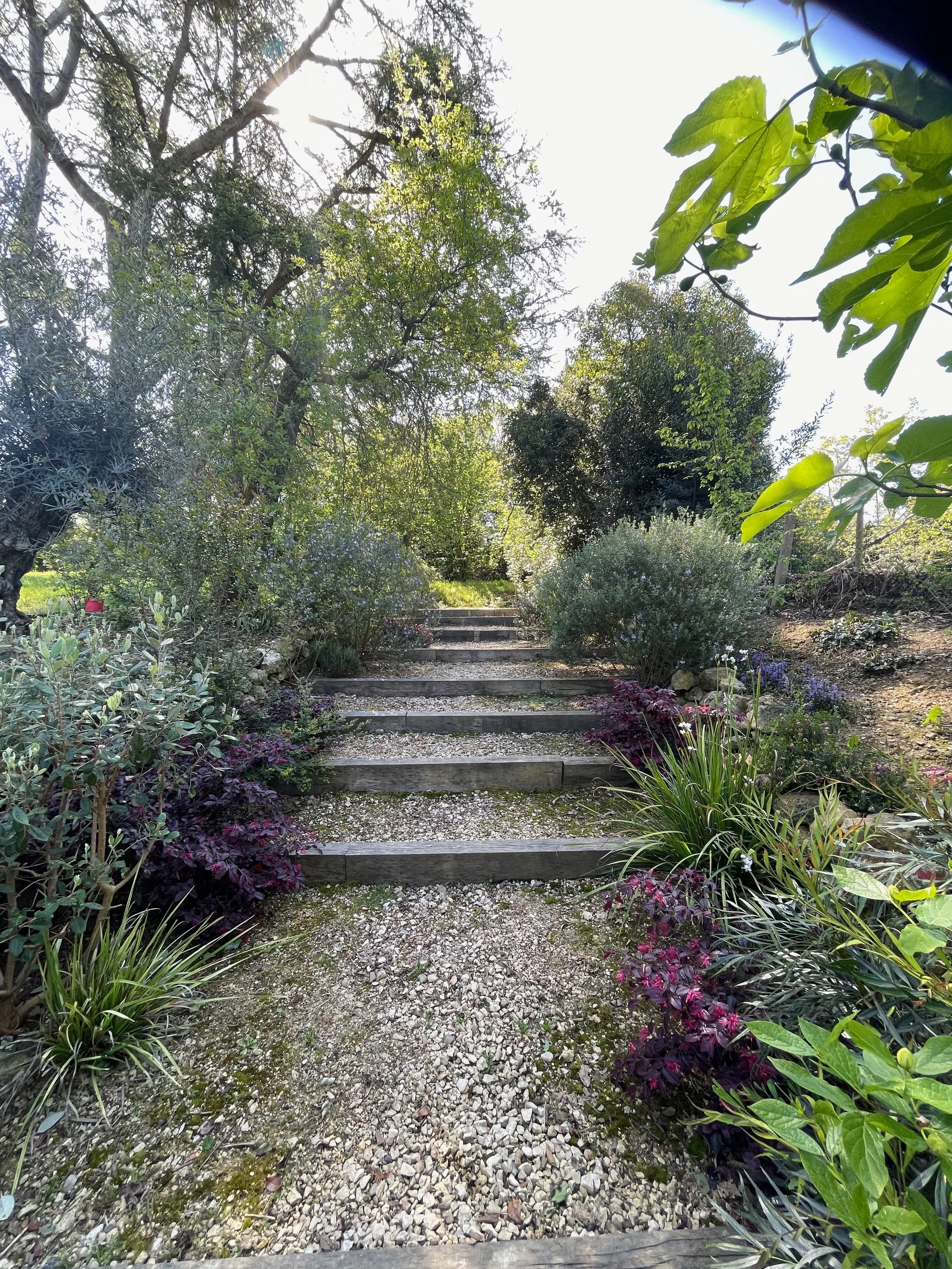 Stone steps in a garden surrounded by lush greenery and trees with sunlight filtering through the leaves. View fullsize