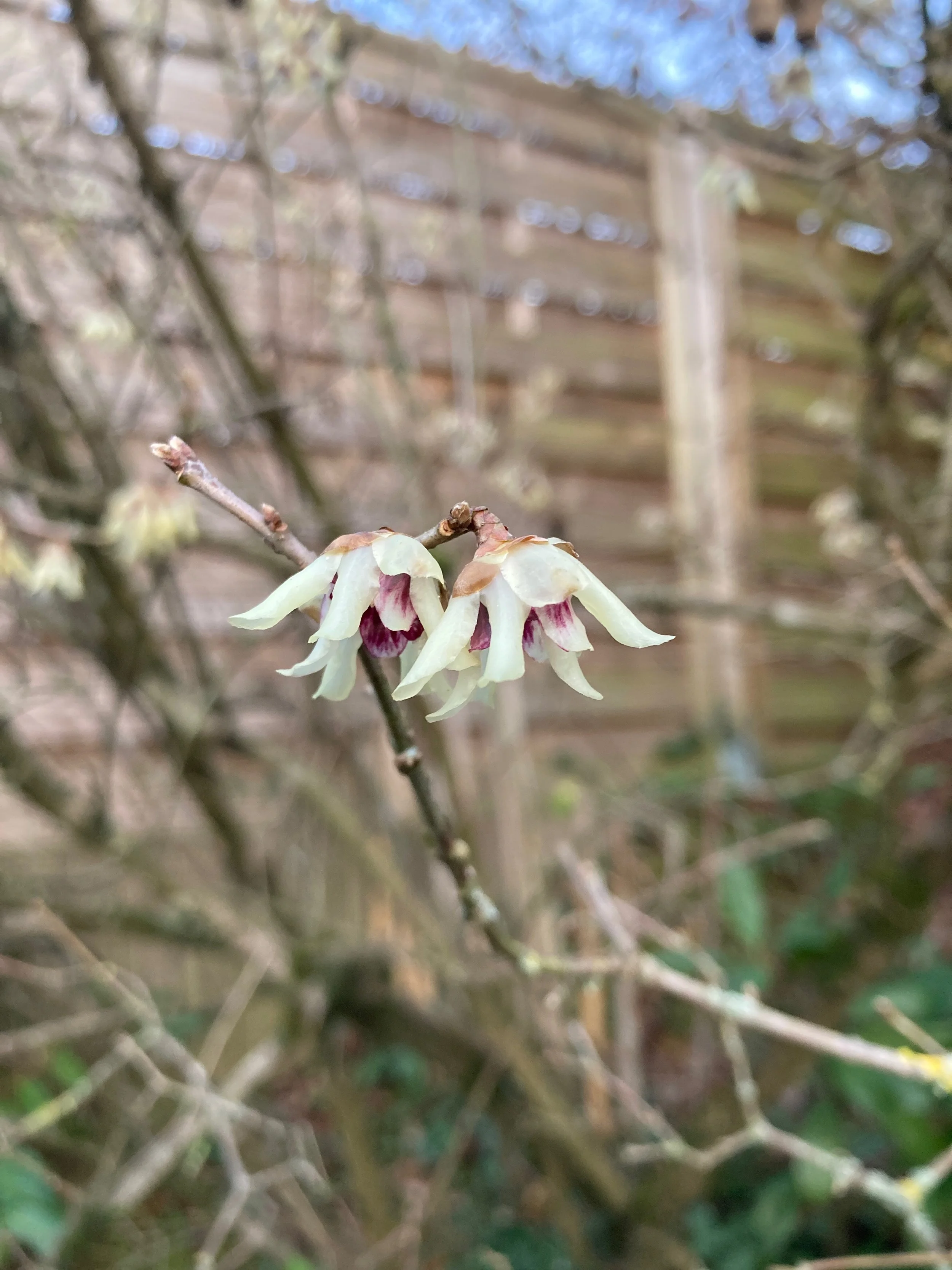 Close-up of blooming winter-flowering shrub with cream and purple flowers against a blurred background of wooden fence and branches.