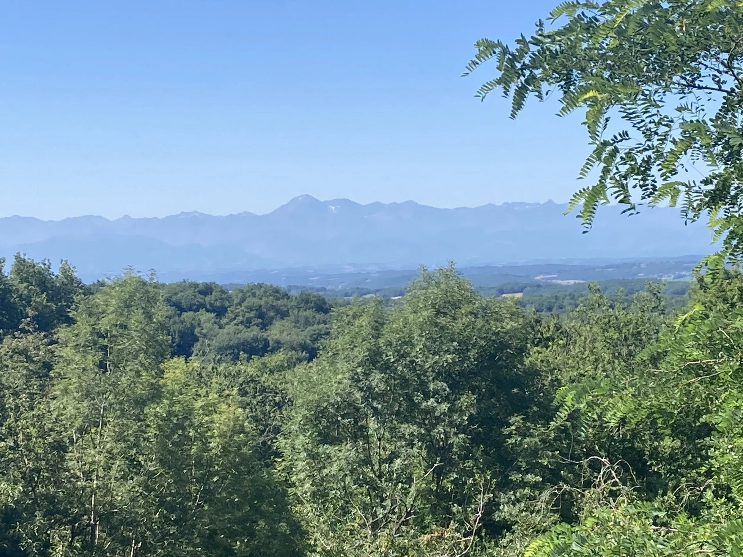 A scenic landscape with a dense green forest in the foreground, rolling hills and mountains in the distance, under a clear blue sky. View fullsize