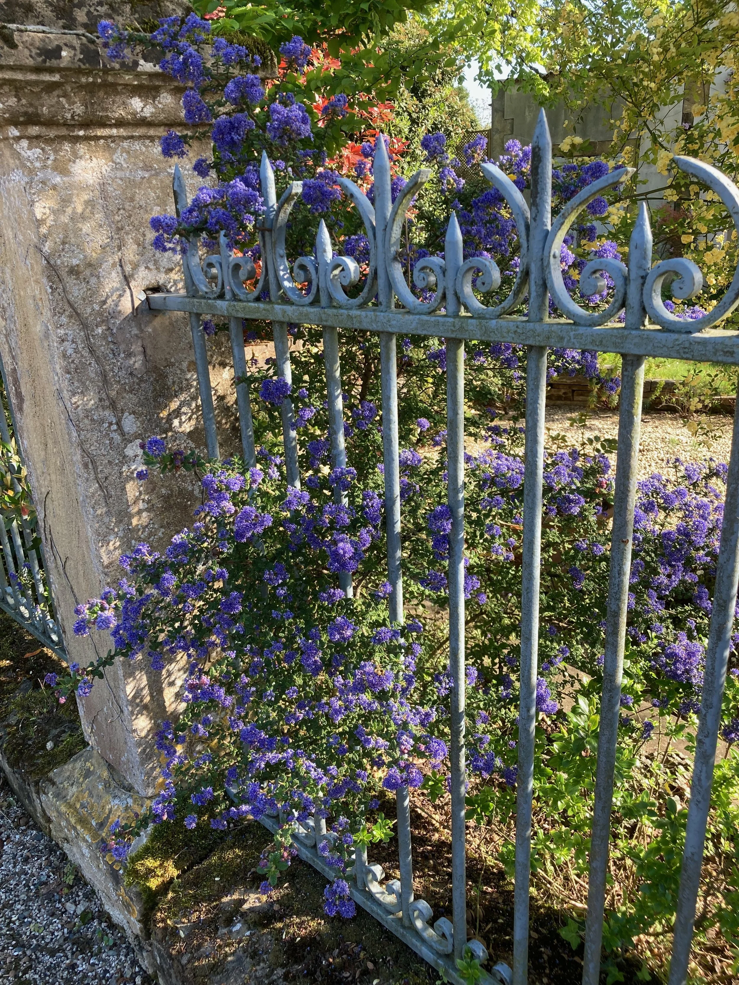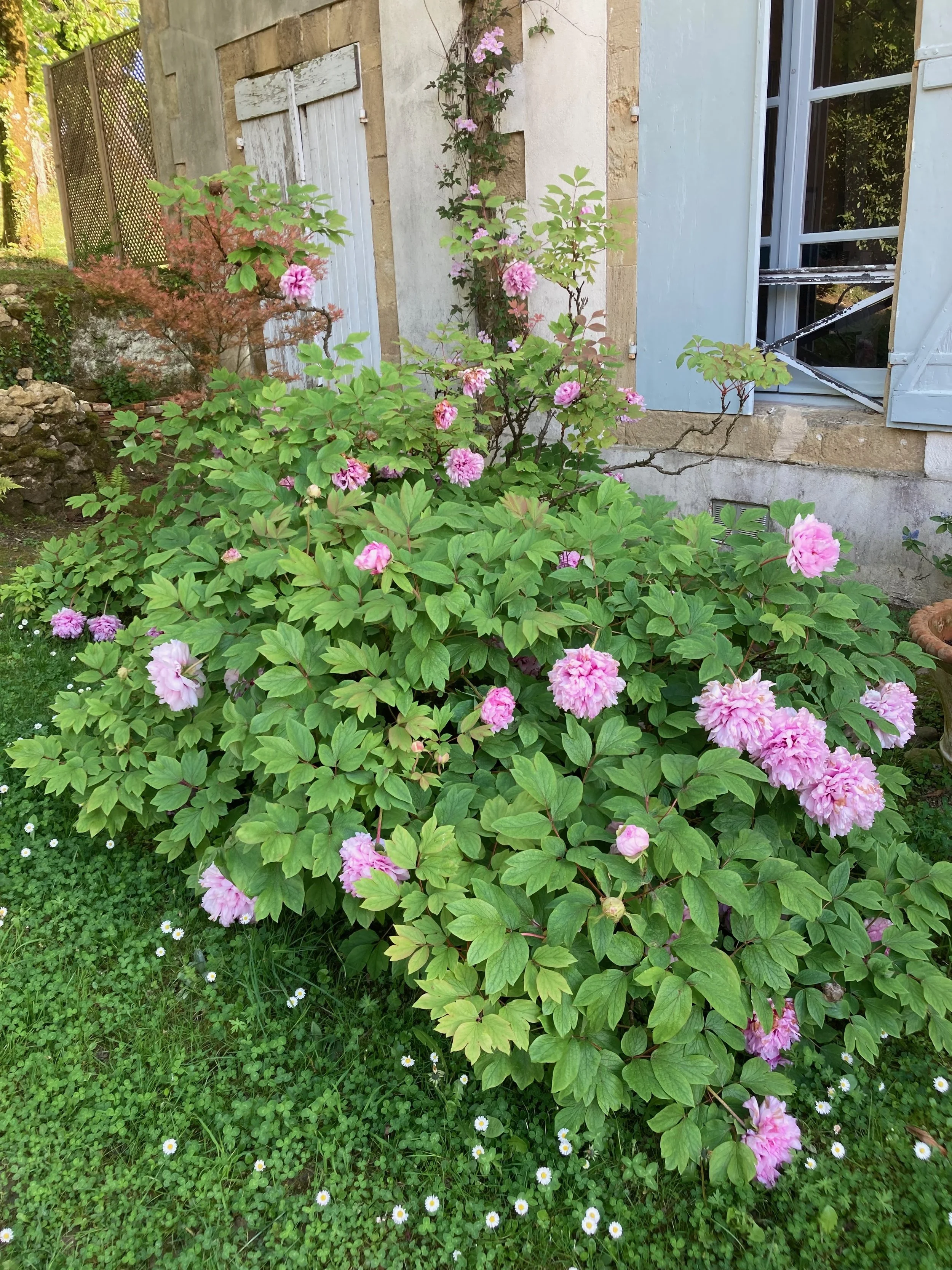 A quaint garden with flowering shrubs, potted plants, and a grassy lawn, with a house with closed shutters in the background. View fullsize