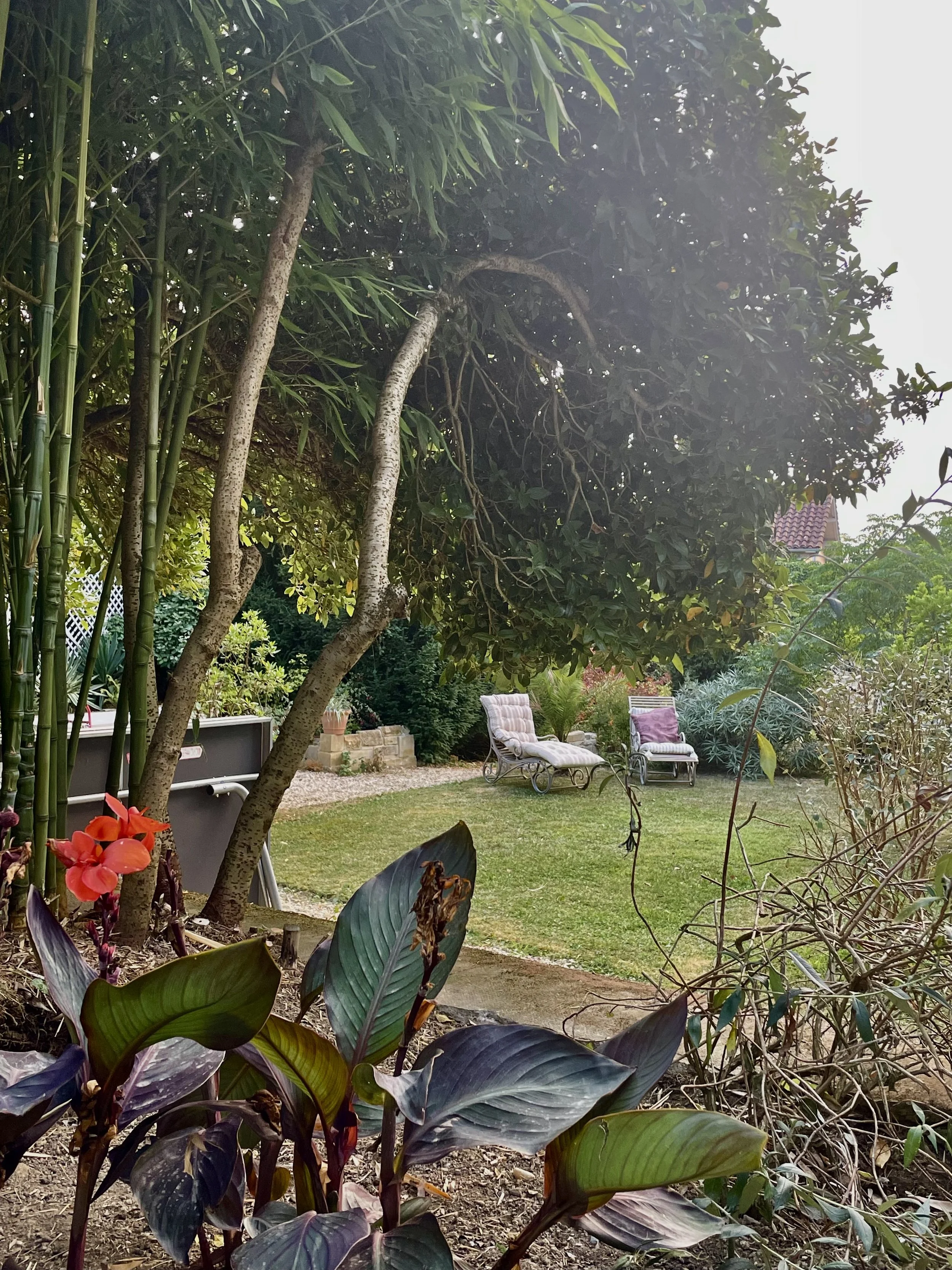 A backyard garden with lush greenery, including trees, plants, and a grassy lawn. There are two lounge chairs with striped cushions and a pink pillow, placed on the lawn. A stone pathway runs through the garden.