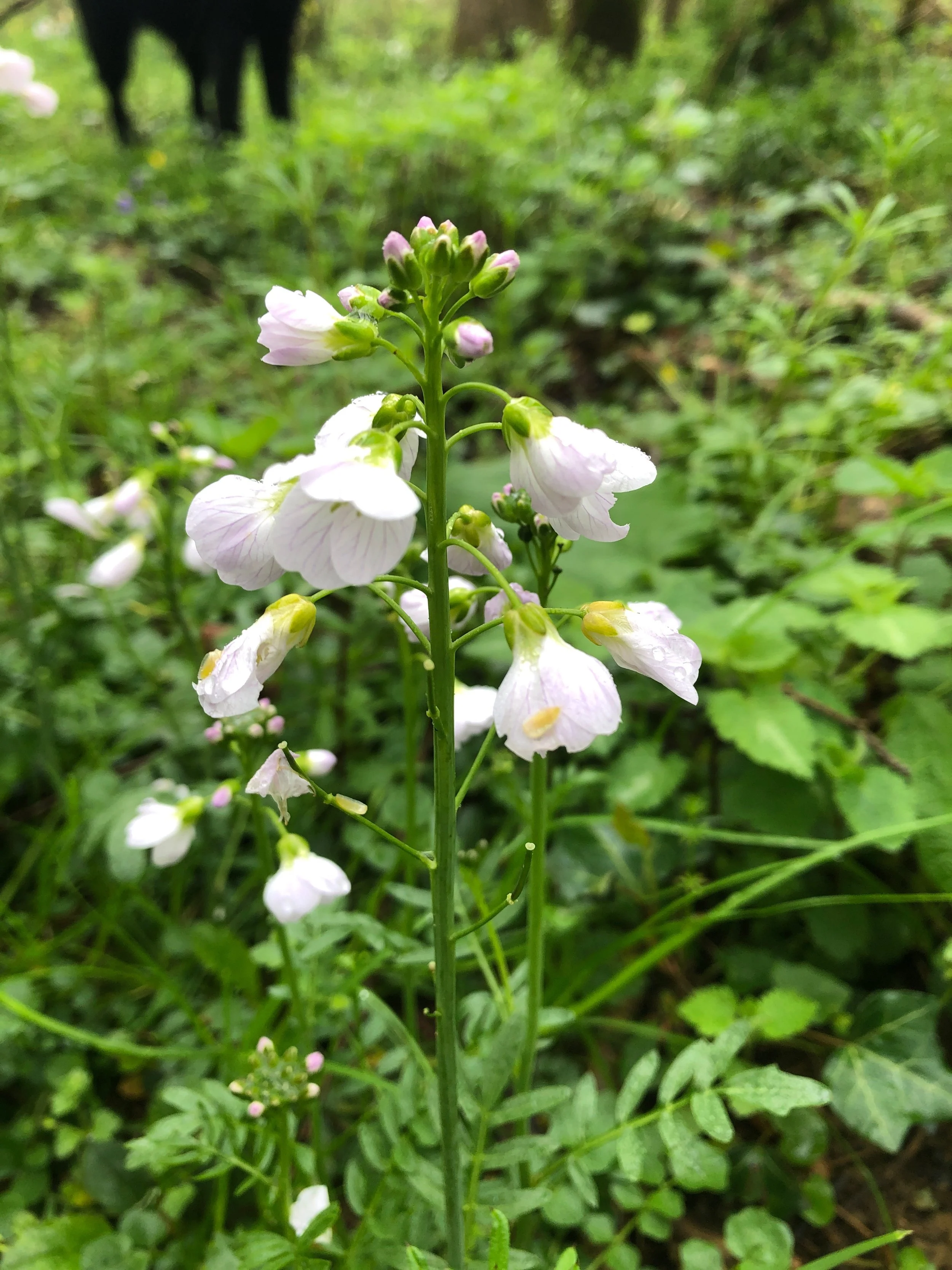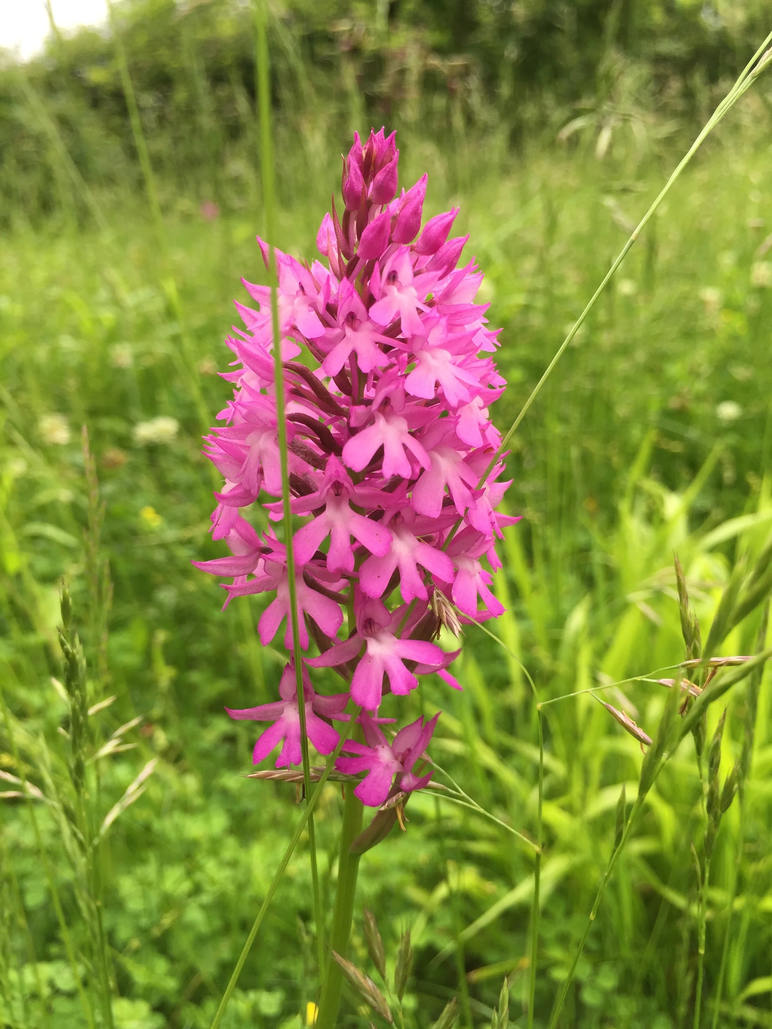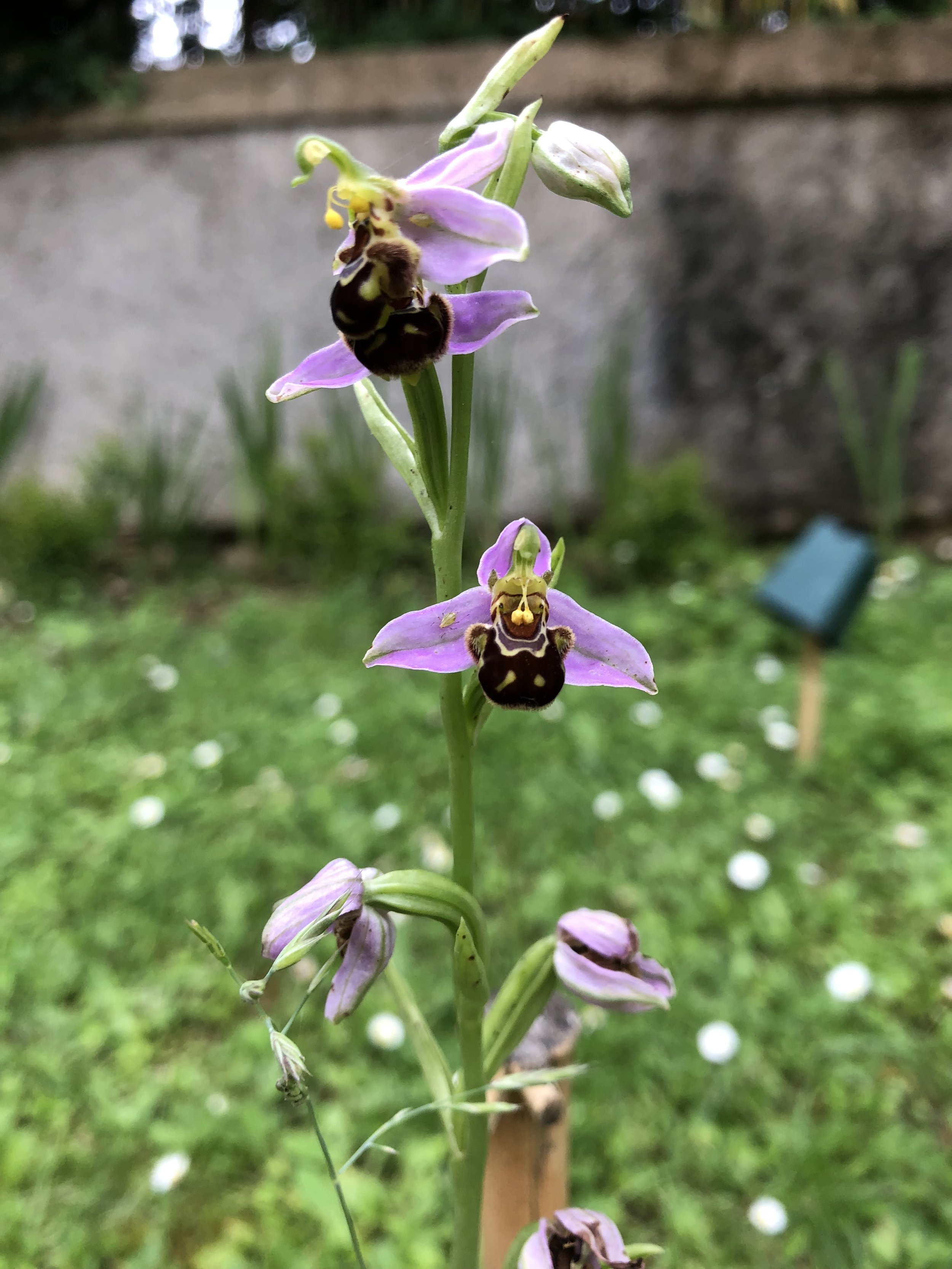 Bee orchid with purple and yellow flowers in a garden setting. View fullsize