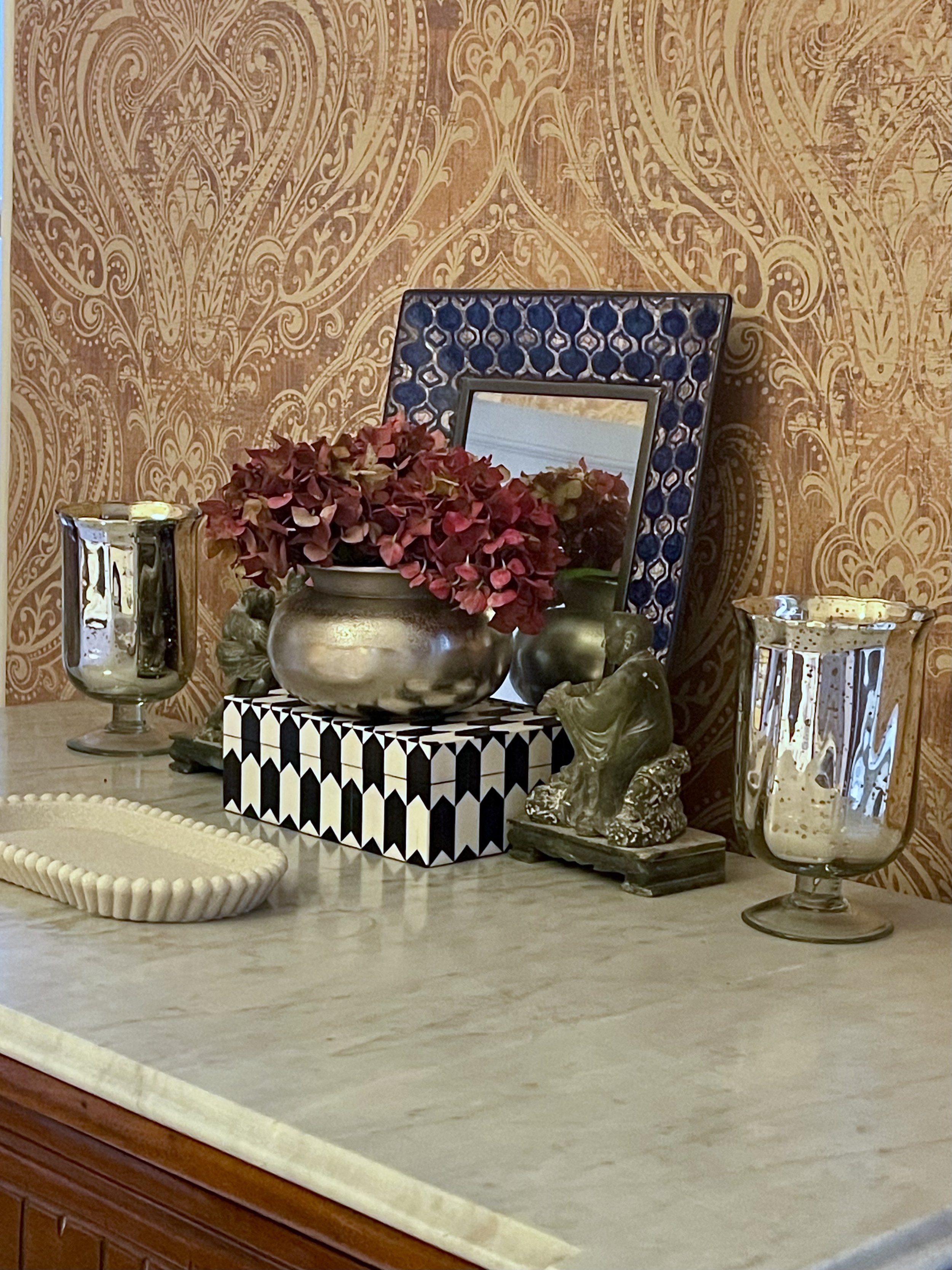 Decorative tabletop with a silver bowl of pink/purple flowers, two silver candle holders, a small statue, and a decorative box, against a patterned wall and mirror background.