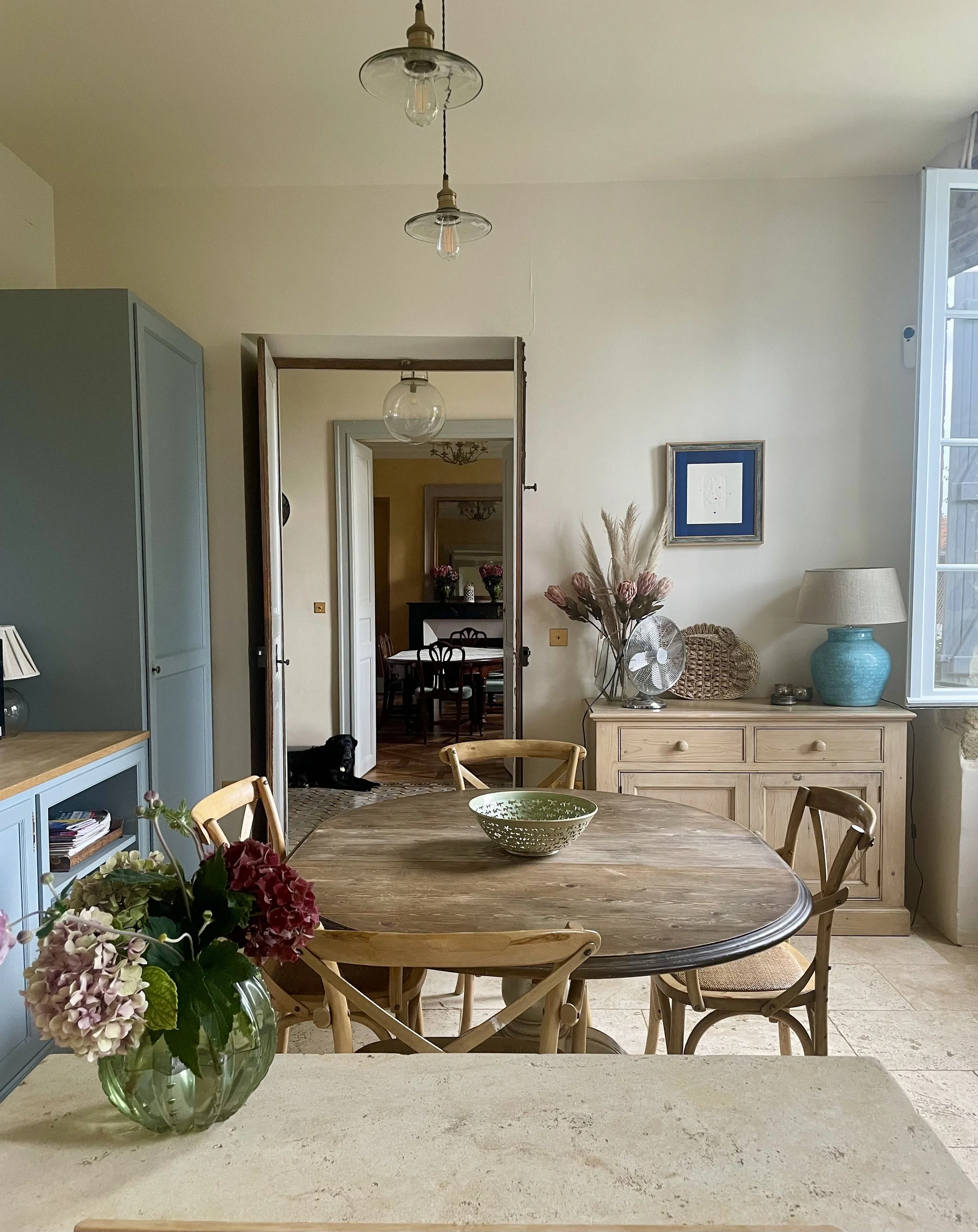 A rustic kitchen with a round wooden dining table surrounded by matching wooden chairs, a beige tiled floor, blue cabinetry, a white stove with copper pots, and decorative pottery on the shelves above the stove, illuminated by natural light.