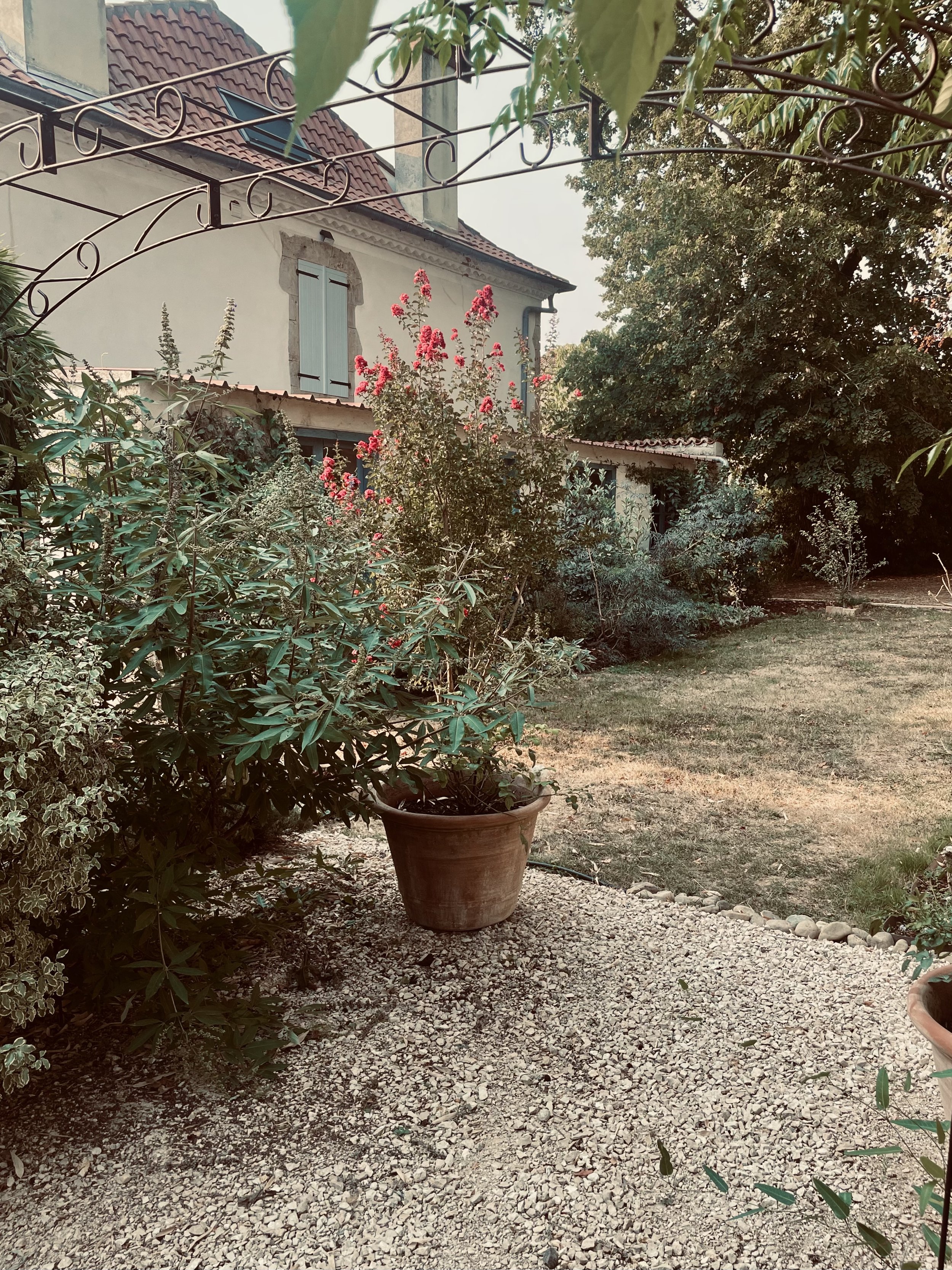 A quaint garden with flowering shrubs, potted plants, and a grassy lawn, with a house with closed shutters in the background.