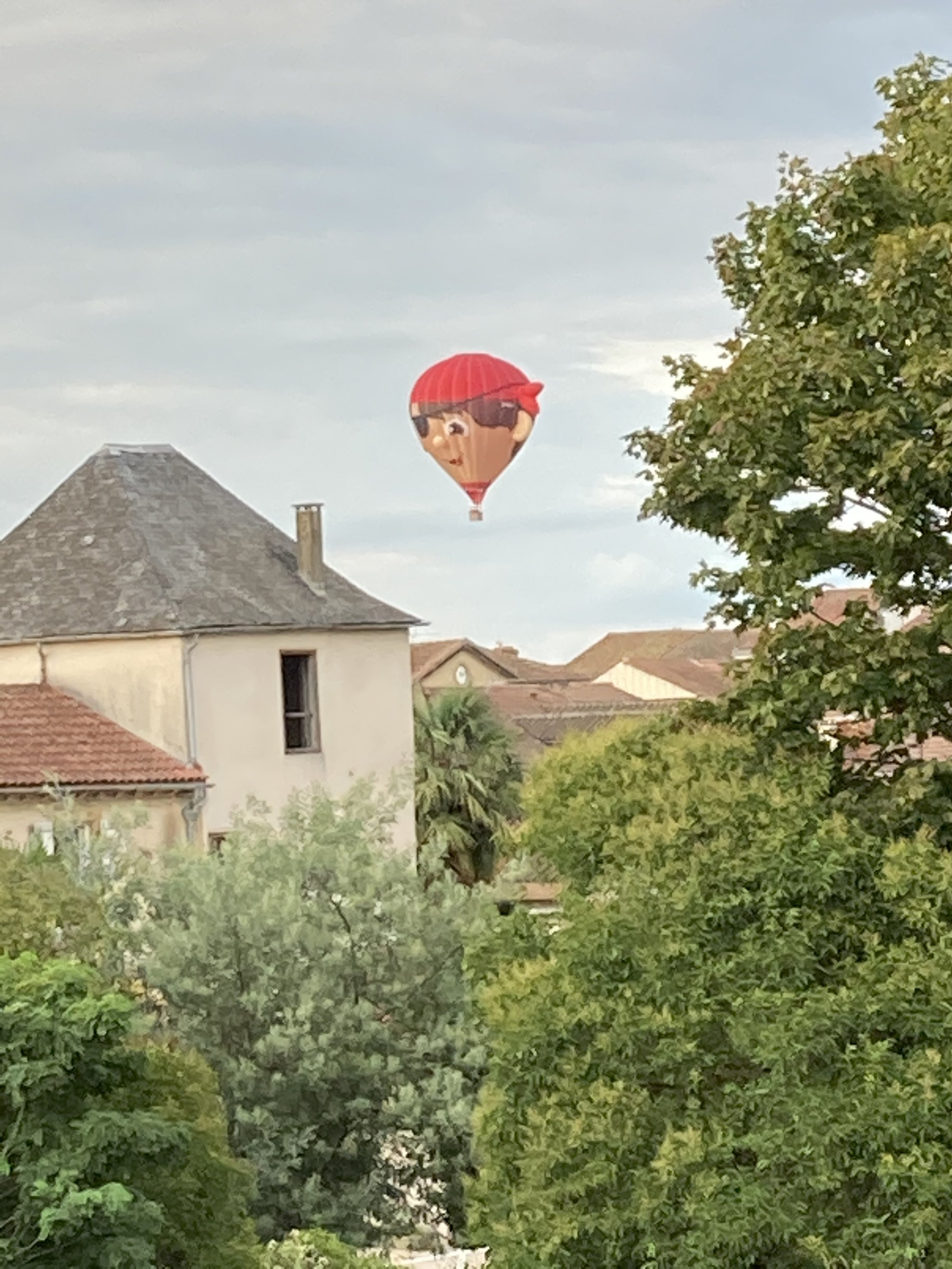 A hot air balloon with a cartoon face design and a red top flies over a neighborhood with trees and houses. View fullsize