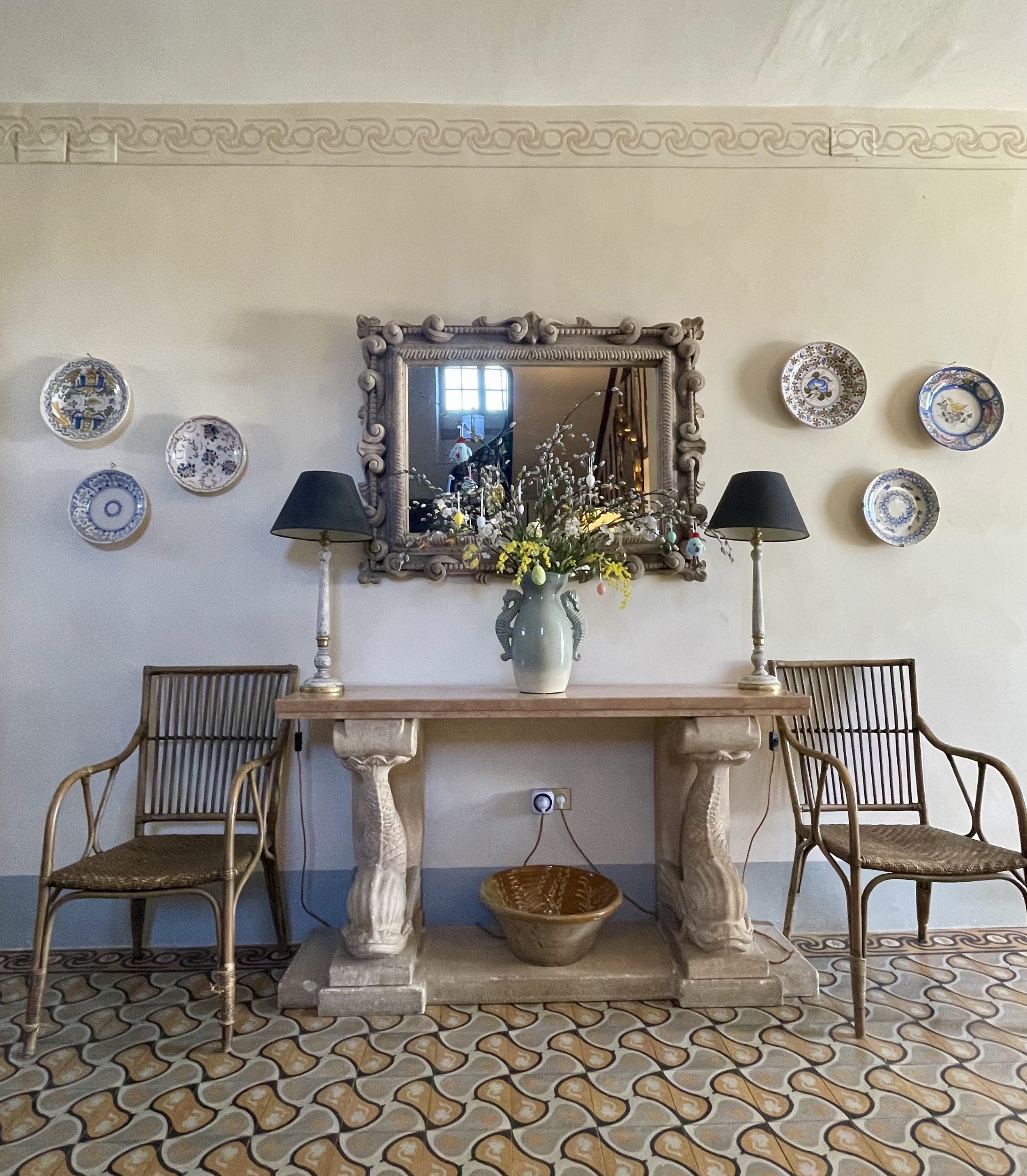 Living room with a wooden console table, large decorative mirror, and two chairs, with wall-mounted plates and lamps.