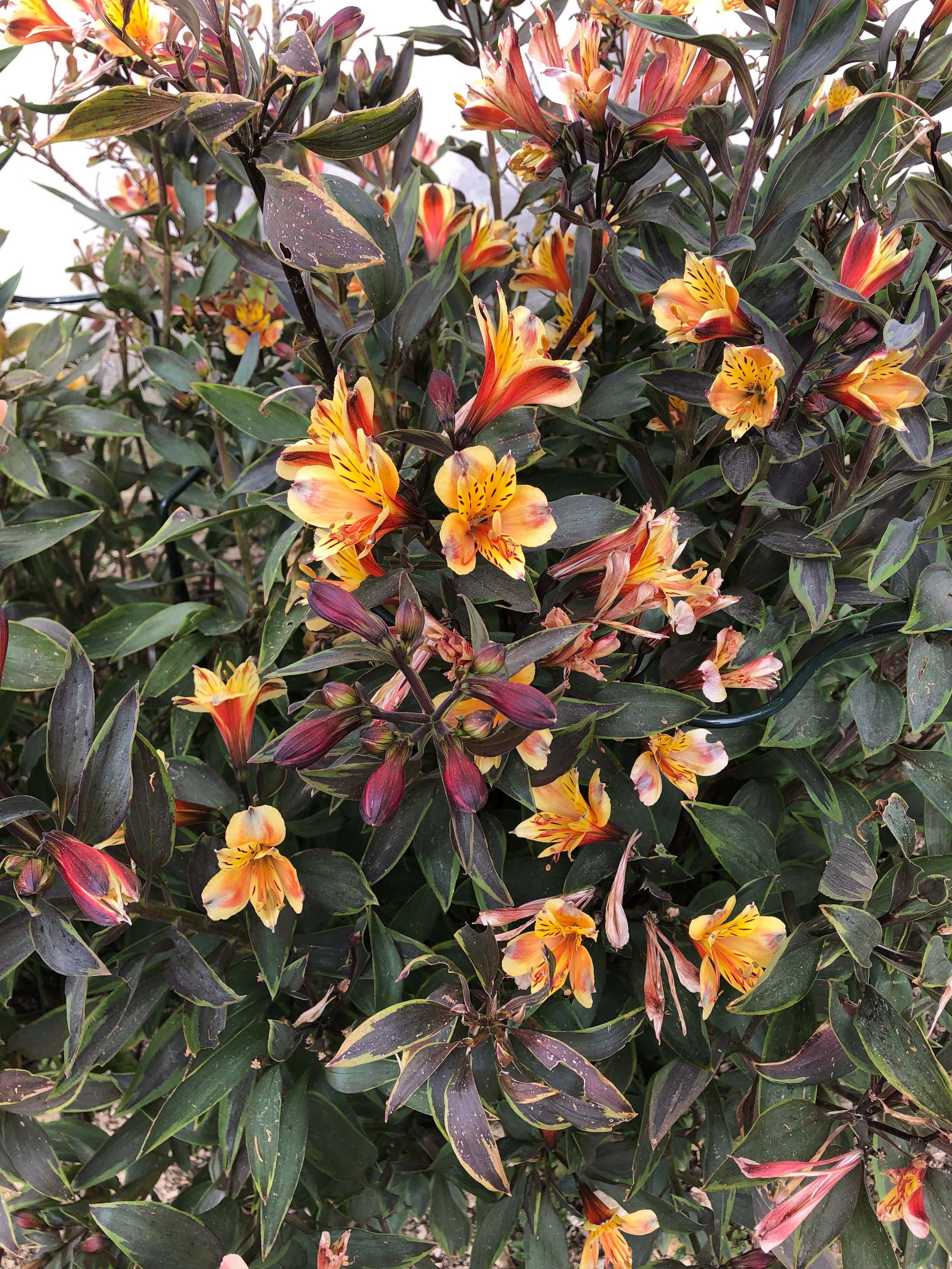 Close-up of vibrant orange and yellow Alstroemeria flowers among dark green leaves.