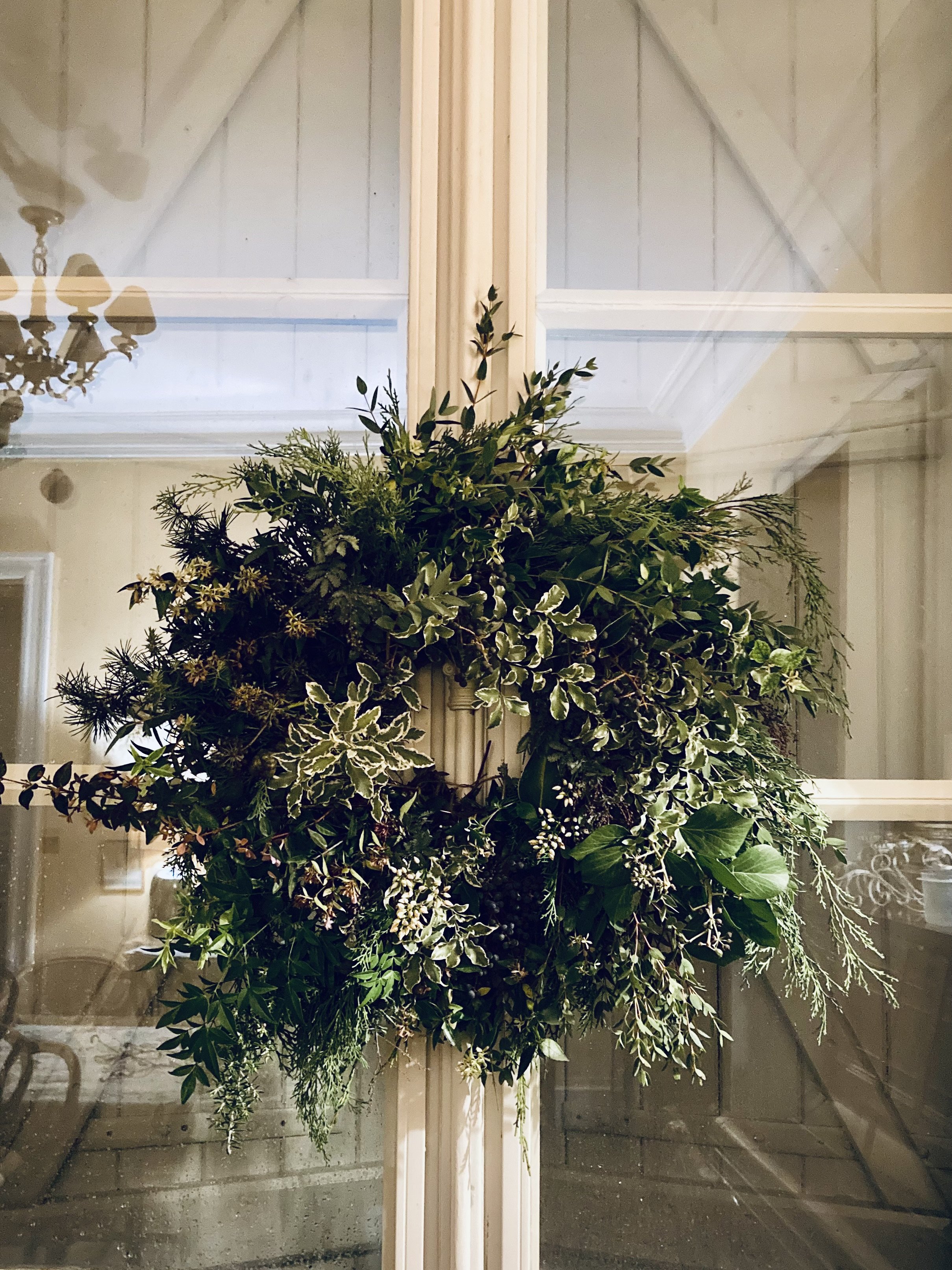 A holiday wreath made of various green foliage hanging on a glass door. View fullsize