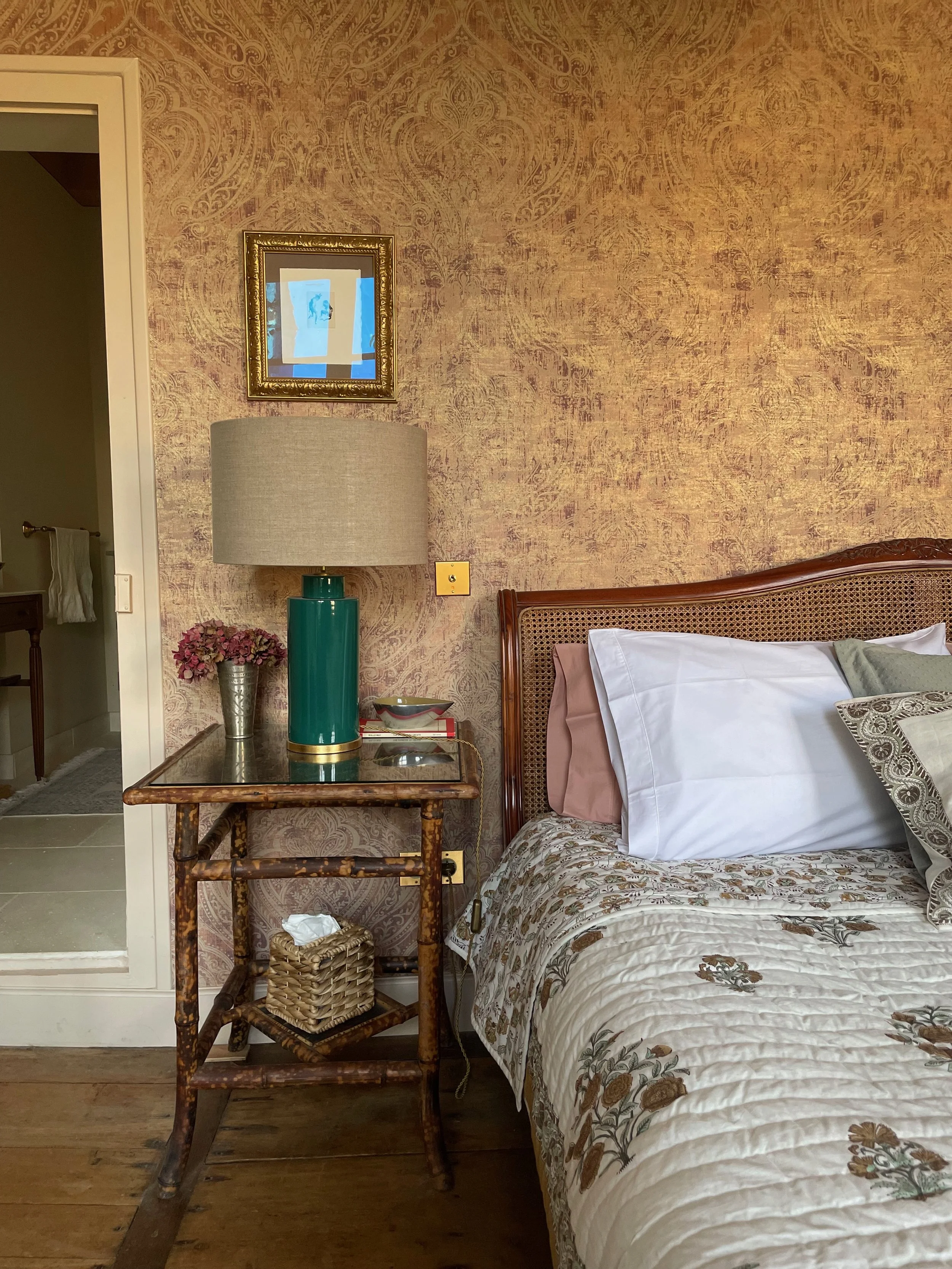 Bedroom interior with vintage wallpaper, a bedside table with a lamp and vase of flowers, wicker tissue holder, and corner of a patterned bedspread.