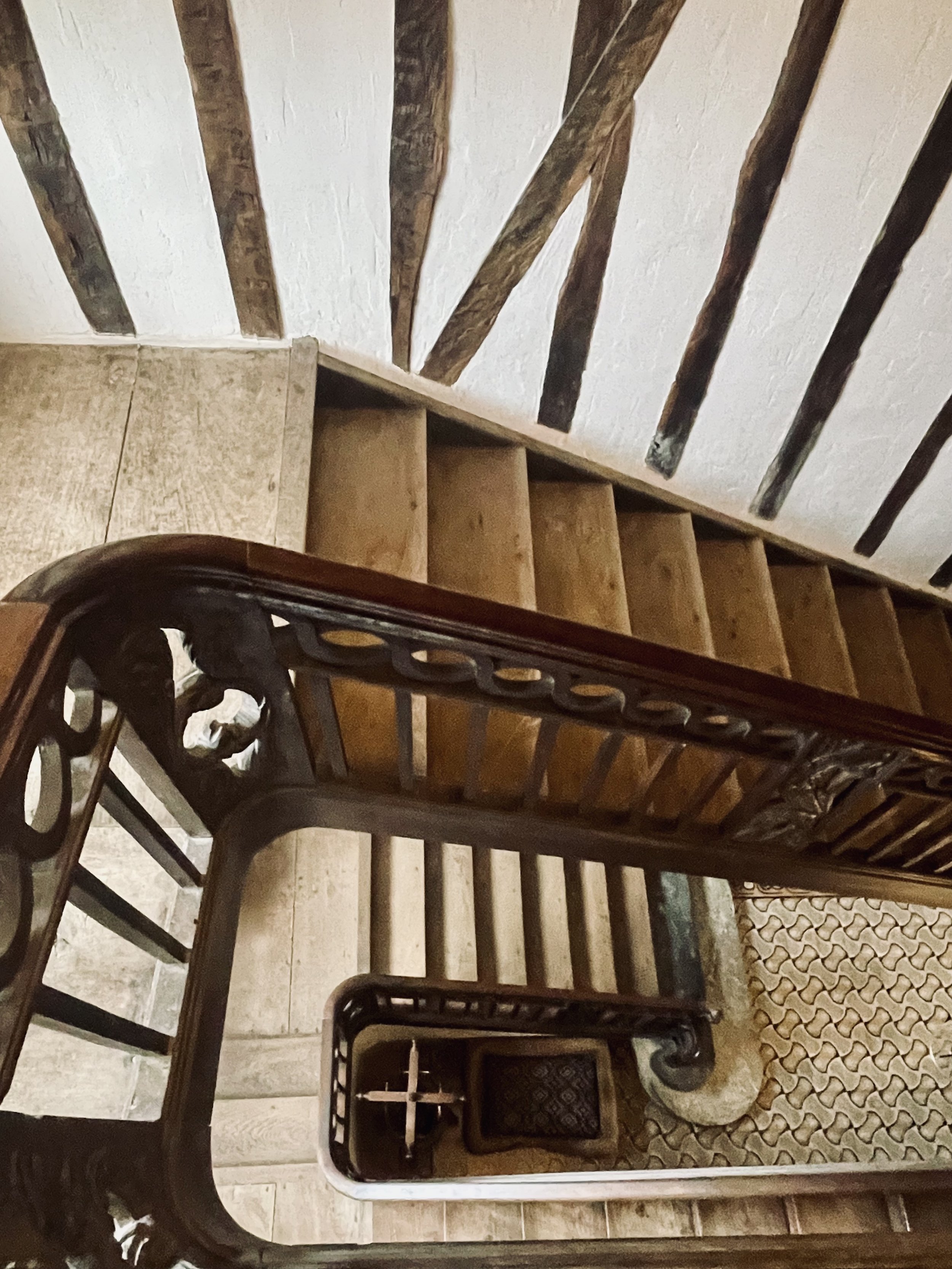 Top view of a wooden staircase with a carved wooden banister, showing the steps and the landing below, with a carved wooden element and patterned tile floor.