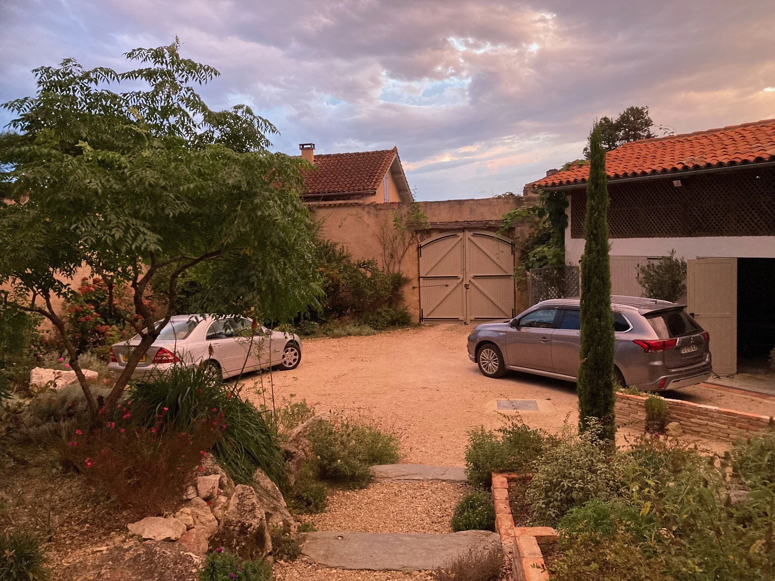 Courtyard with two parked cars, surrounded by greenery and a stone path, under a cloudy sky. View fullsize