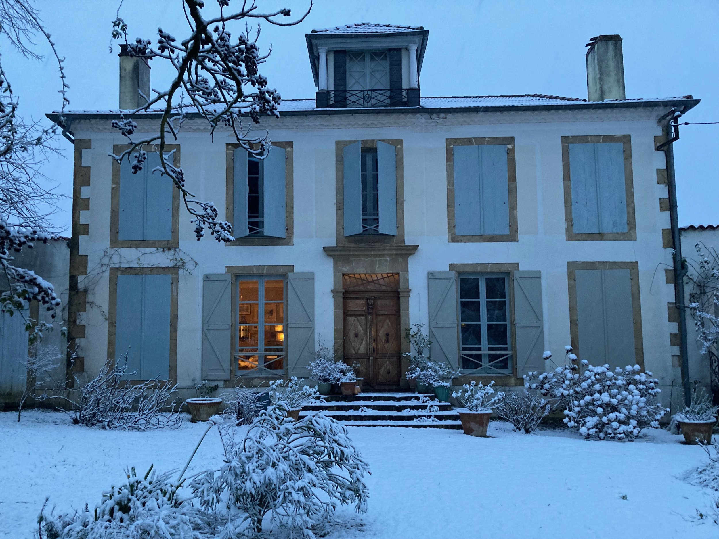 Snow-covered garden with trees and shrubs, a tall structure in the background, and traditional European architecture partially visible.