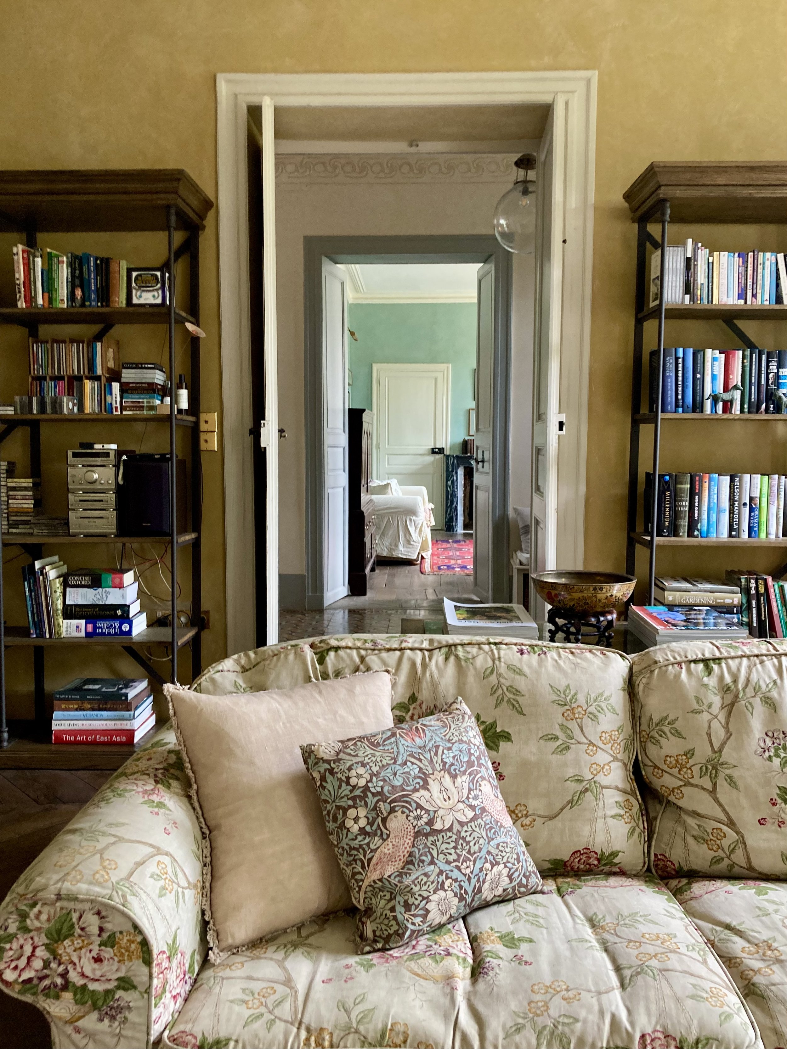 A living room with a floral-patterned sofa, two decorative pillows, and two bookshelves filled with books, with a view into another room with a green wall and white furniture. View fullsize