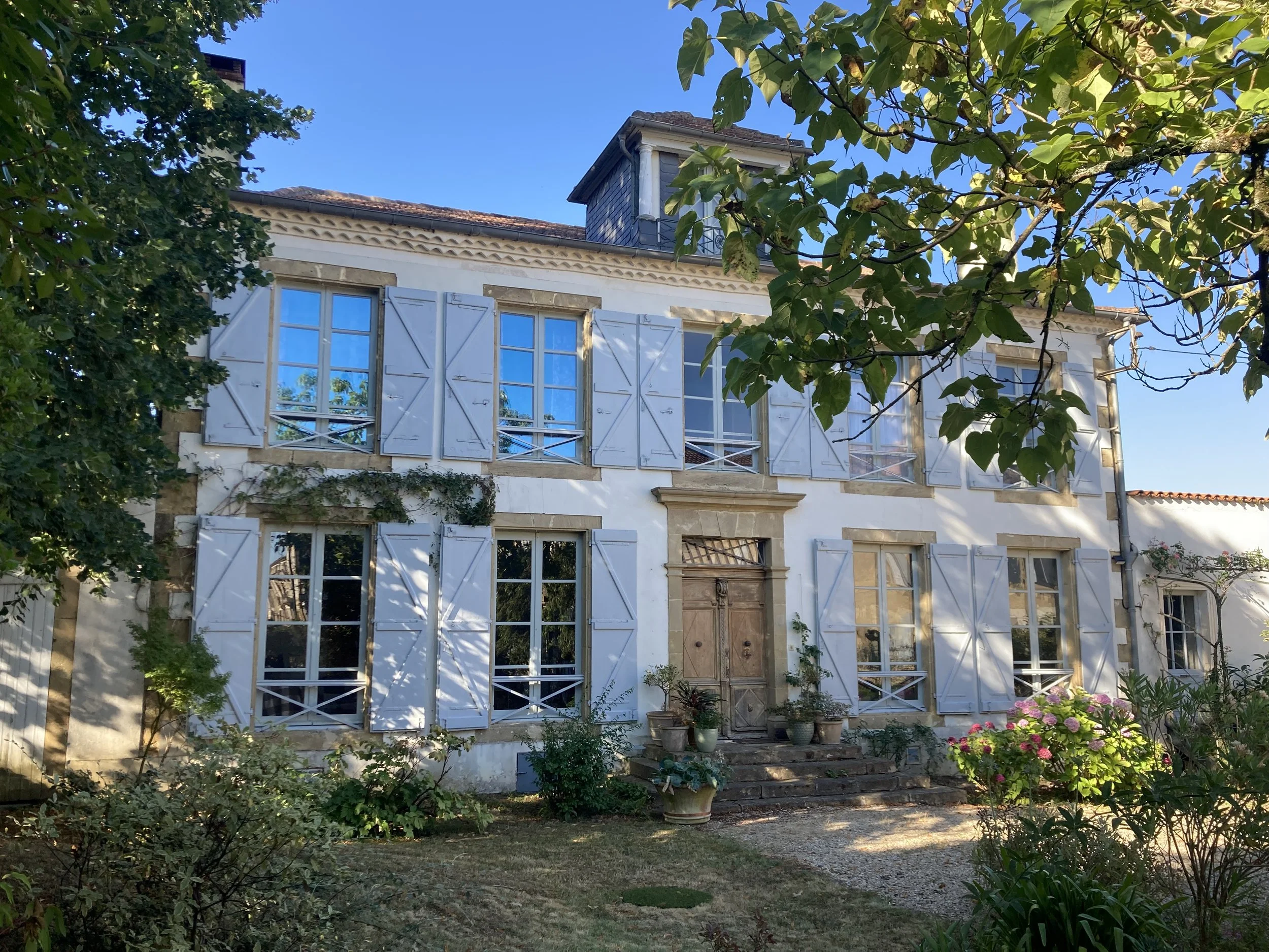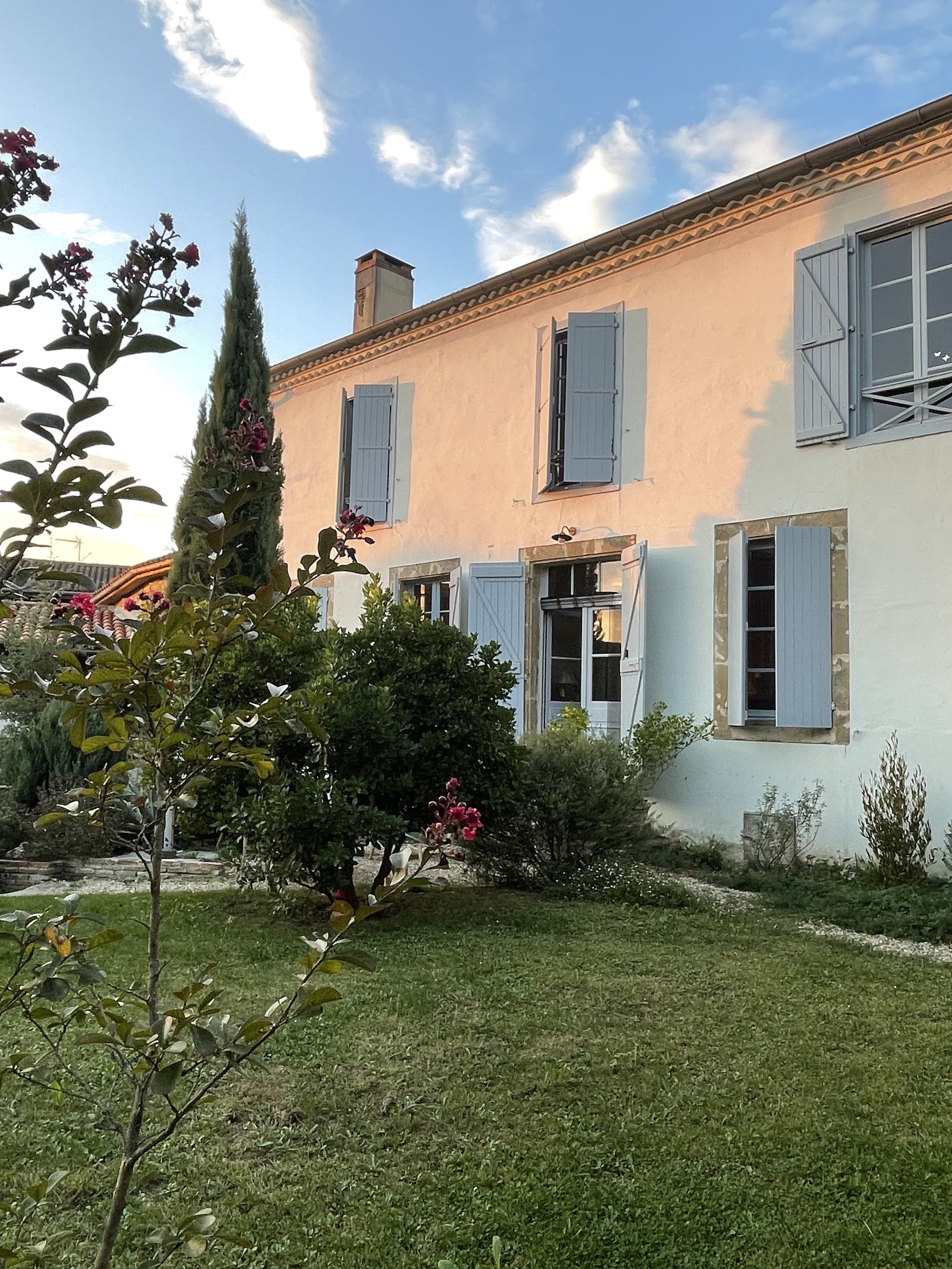 Charming house with blue shutters, surrounded by a lush garden, under a blue sky with clouds.
