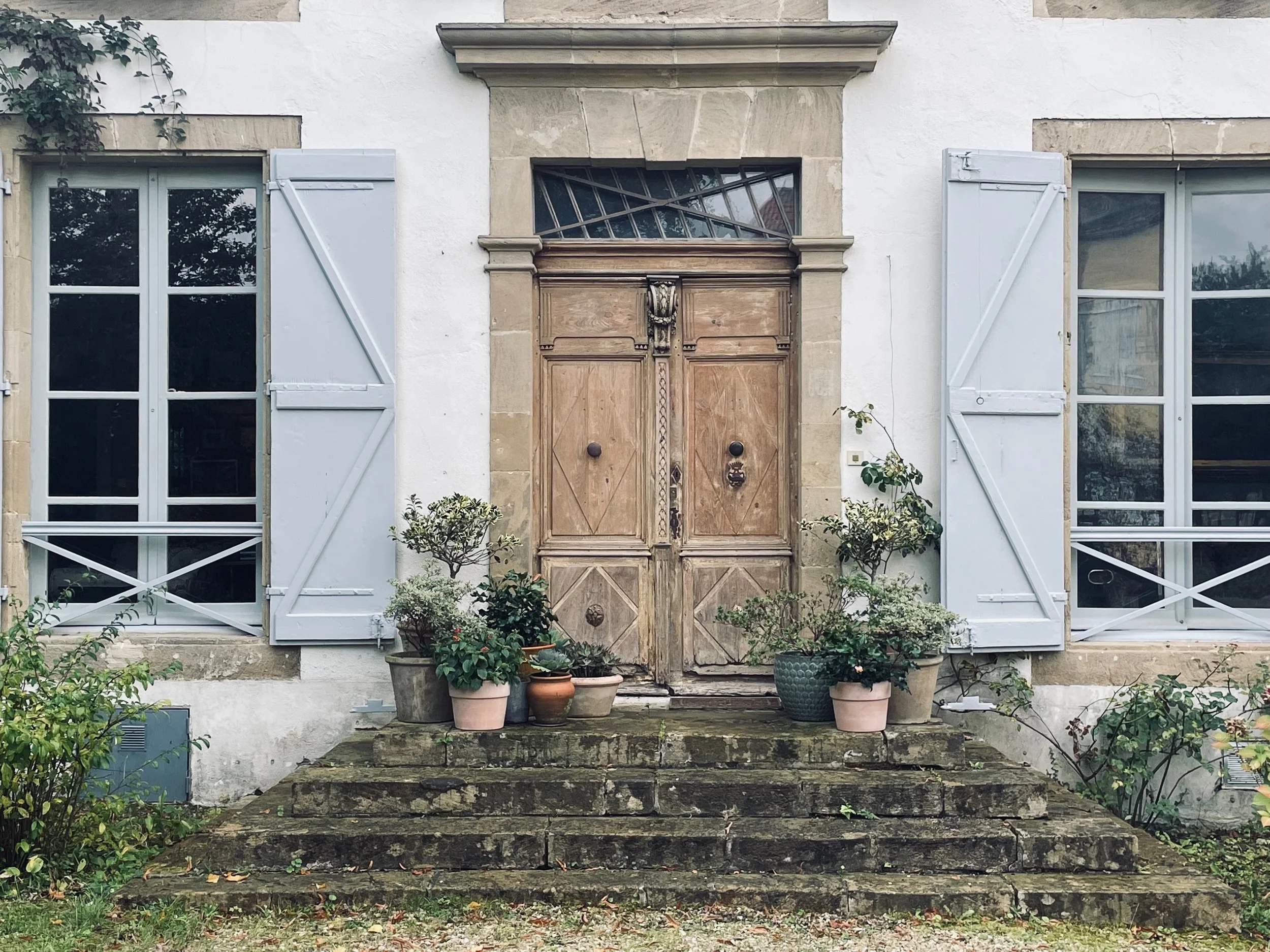 Vintage wooden door with decorative plants on stone steps, framed by large windows with light-colored shutters on both sides.