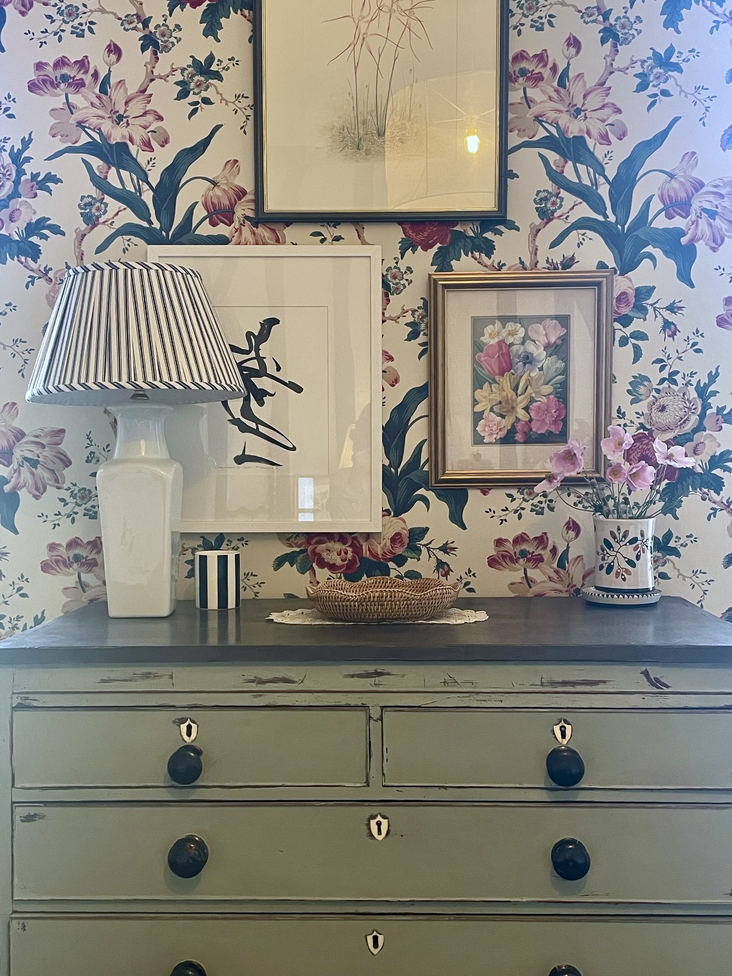 A vintage dresser with a lamp, decorative bowl, striped cup, and a flower vase on top; floral wallpaper and framed artwork on the wall. View fullsize
