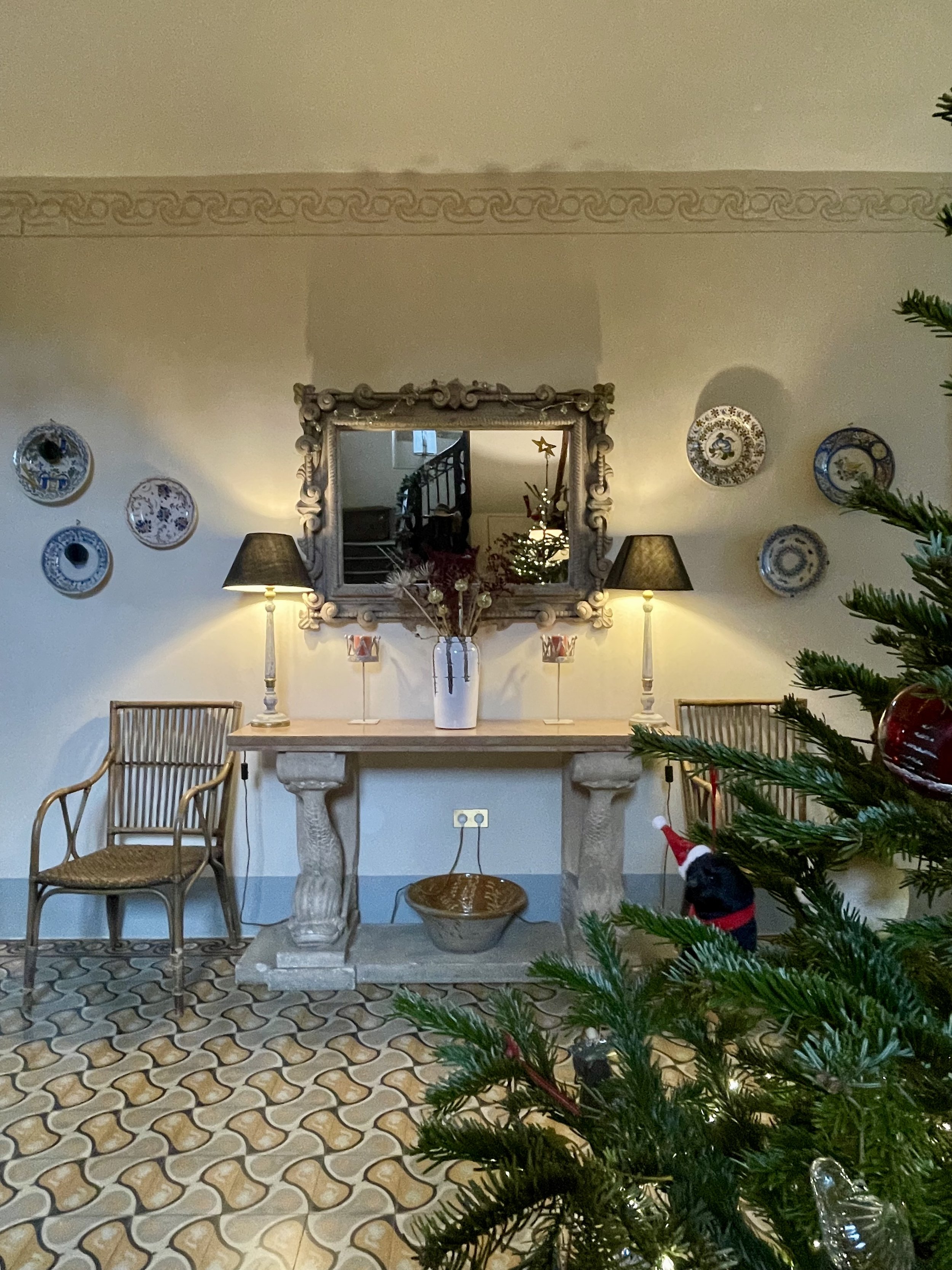 An interior living room decorated for Christmas with a Christmas tree on the right side, a large ornate mirror above a beige console table, two table lamps, a wicker chair on the left, and decorative plates on the wall.