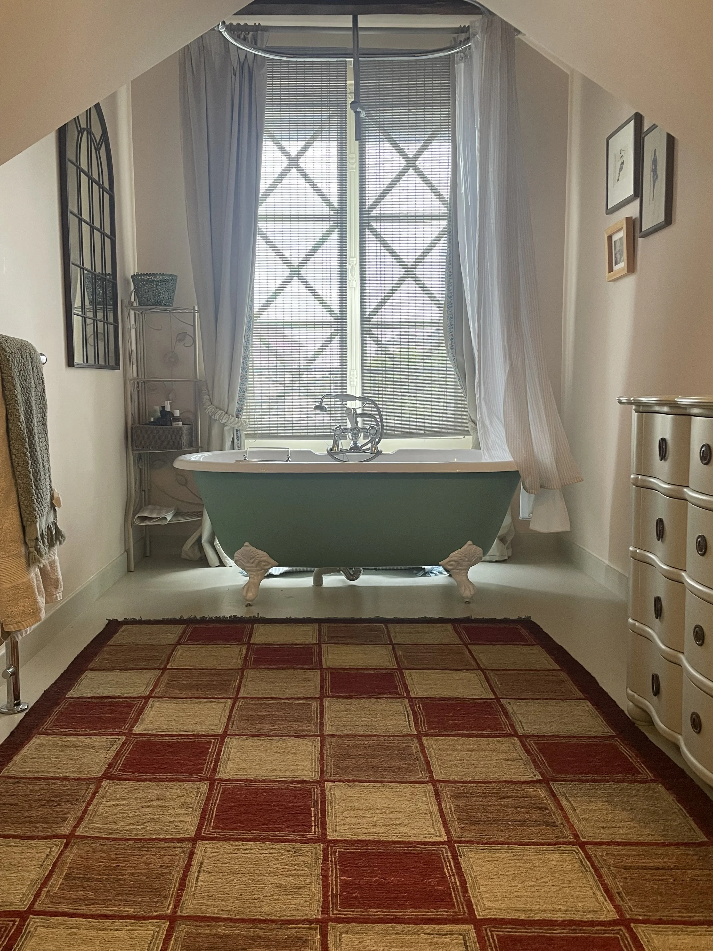 A bathroom with a vintage-style clawfoot bathtub positioned in front of a large window with bamboo blinds and sheer curtains. A red and yellow checkered rug covers the floor. To the right, there is a white curved dresser, and on the left, a small she
