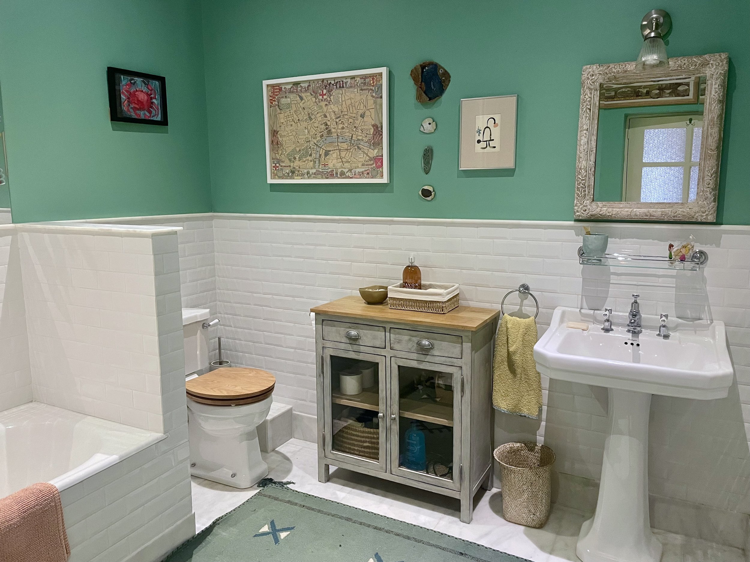 Bathroom with green upper walls, white subway tile wainscoting, and various wall art including a map, framed pictures, and a fish sculpture. Features a white pedestal sink, a small wooden cabinet, a toilet with a wooden lid, and a bathtub partially v View fullsize