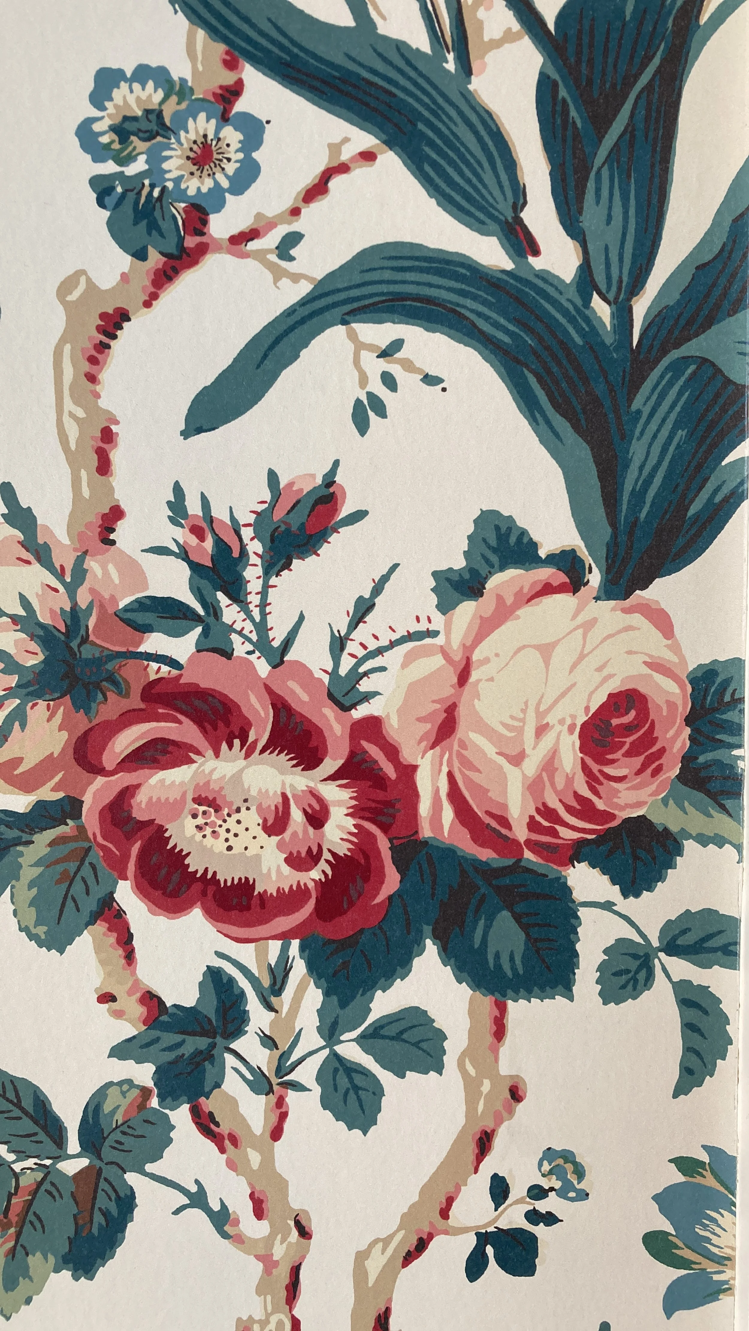 Vintage floral wallpaper with red and cream roses, blue flowers, green leaves, and decorative vines on a light background.