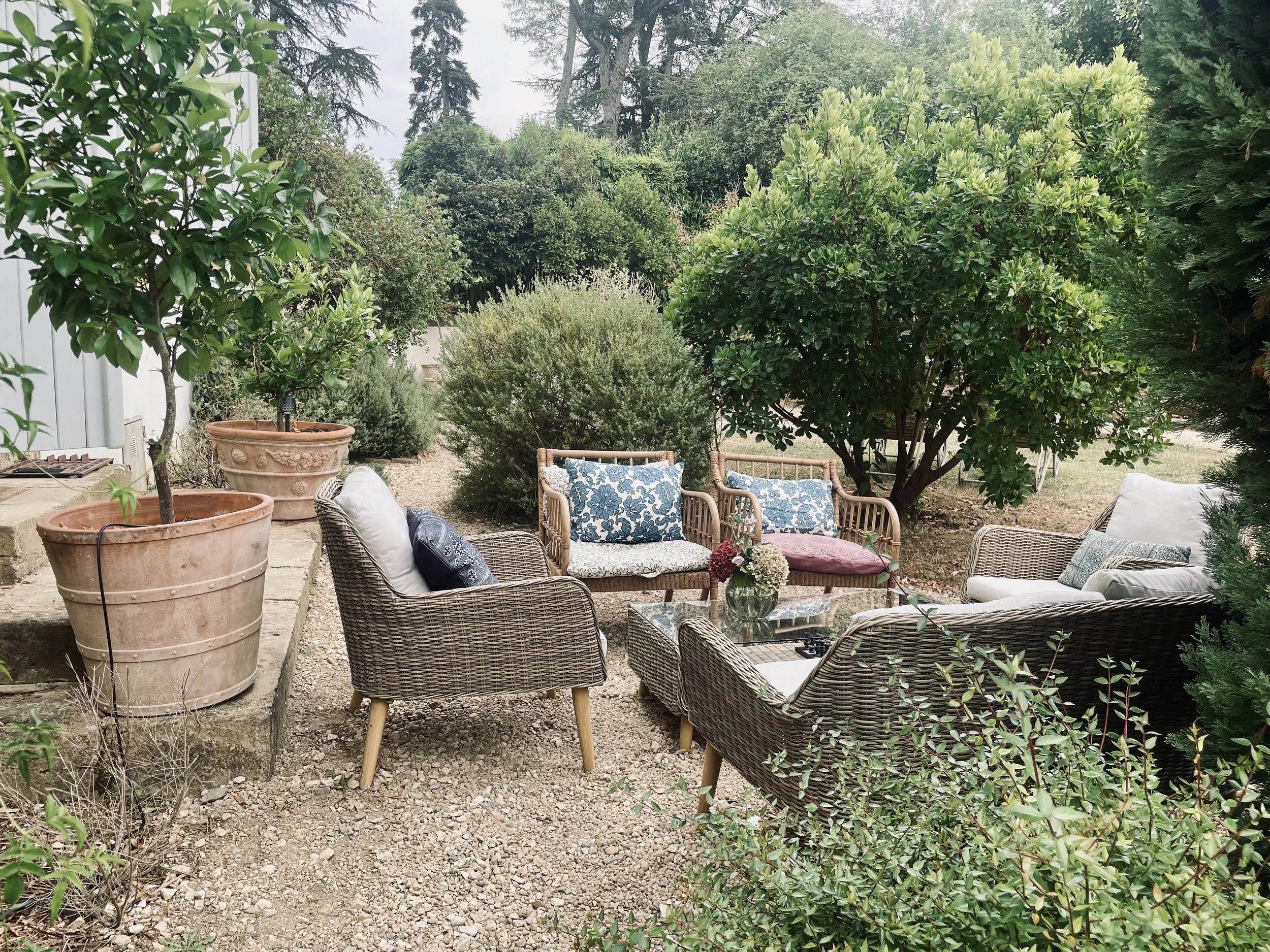 Outdoor garden seating area with wicker and wooden furniture, cushions, and a glass coffee table, surrounded by greenery including potted trees and bushes.
