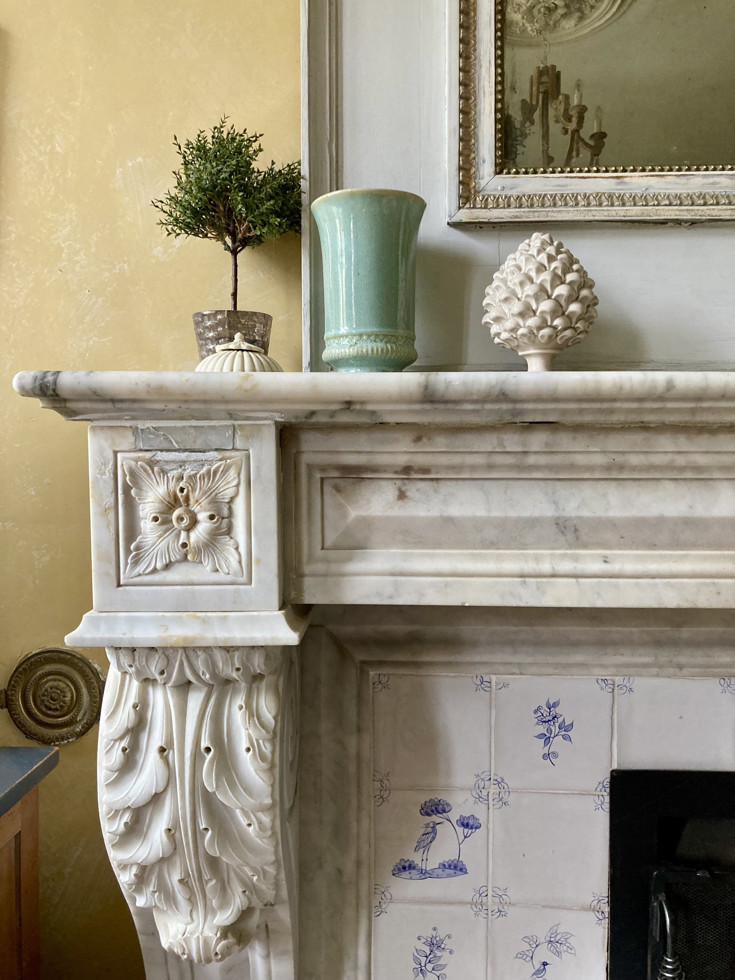 Decorative marble fireplace mantel with a potted plant, a green ceramic vase, and a white sculptural object resembling a pine cone, with a large mirror and a textured yellow wall in the background.