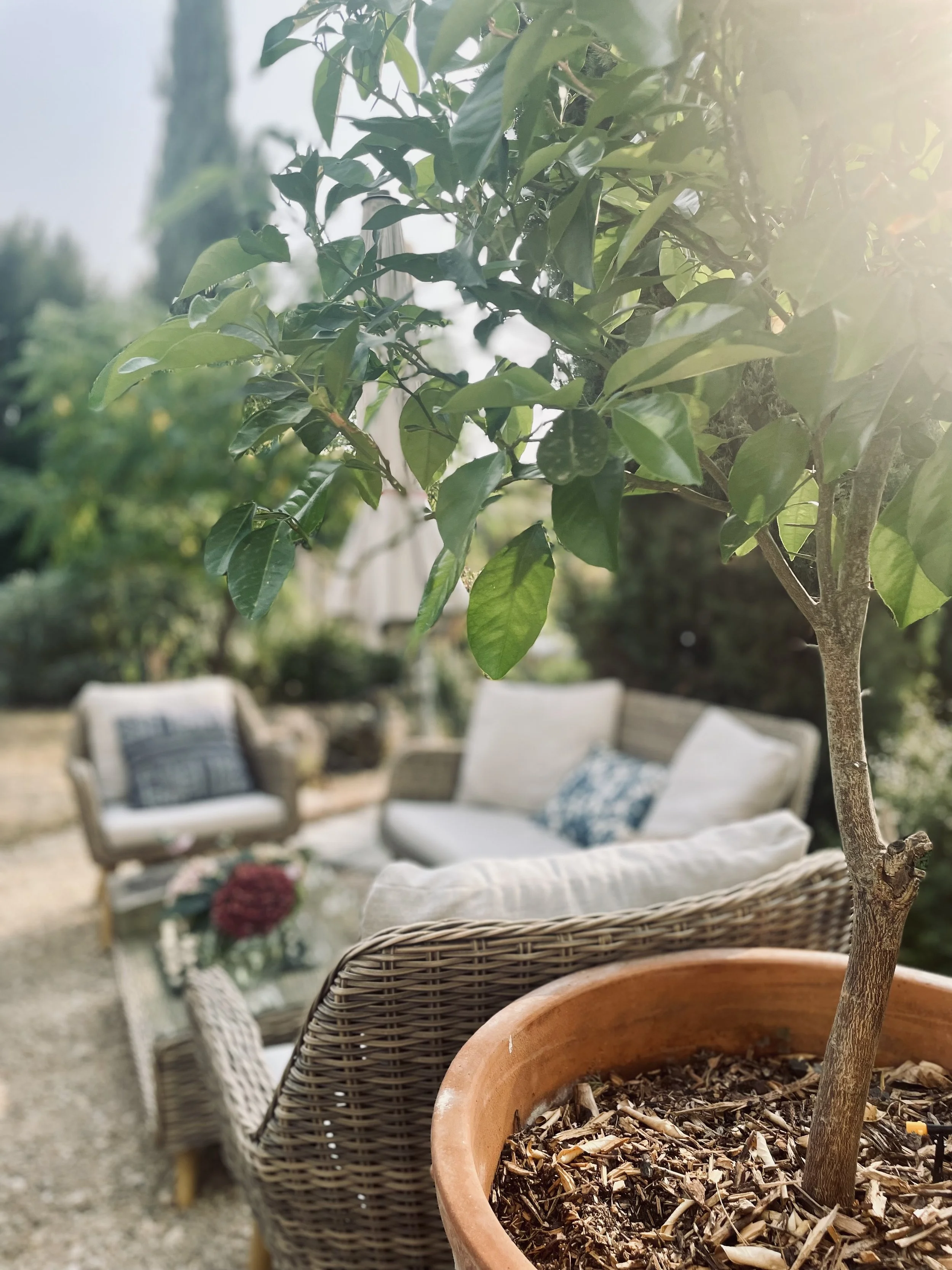 Close-up of a potted tree with green leaves, with outdoor wicker furniture and cushions in the background.